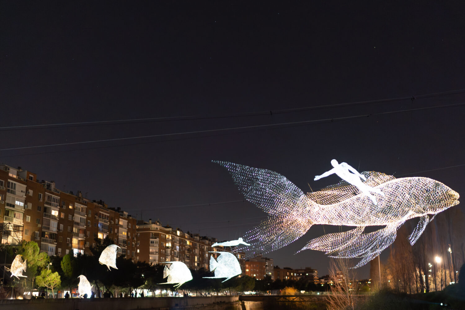 Después, en la glorieta de San Víctor, en la colonia del Pico del Pañuelo, se ha podido ver Redentora, del artista vallisoletano Gonzalo Borondo, una instalación que recrea un gran zoótropo que pone en movimiento imágenes de víctimas animales y de sus verdugos, los matarifes, y que propone una reflexión sobre la violencia silenciada, la vocación sagrada y el ritual como espacio de encuentro comunitario, con un espacio sonoro firmado por El Niño de Elche. La visita ha continuado en la presa número 8 de Madrid Río con Nadar la noche, de Cédric Leborgne, donde esculturas de malla metálica suspendidas en el aire componen una escena poética que parece flotar entre el río Manzanares y el cielo.