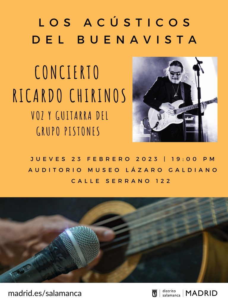Por cuarto año consecutivo, la Junta Municipal del Distrito de Salamanca organiza el ciclo de conciertos Los Acústicos del Buenavista. El jueves 23 de febrero, el encargado de iniciar esta temporada será Ricardo Chirinos, fundador, cantante, guitarrista y compositor de uno de los grupos referentes de la movida madrileña, Pistones.