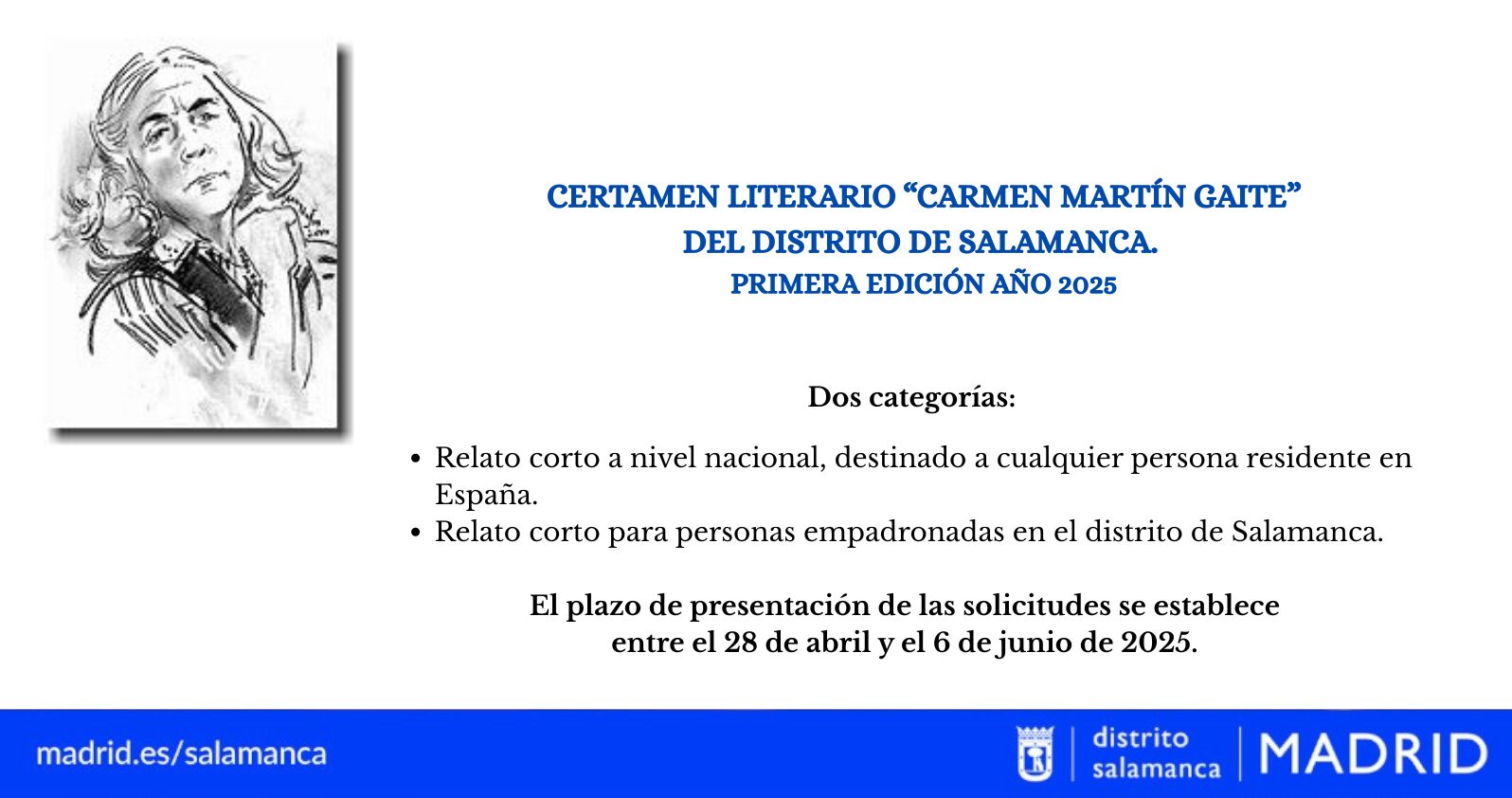 El distrito de Salamanca abre el plazo para inscribirse en el I Certamen Literario Carmen Martín Gaite para obras inéditas en la modalidad de relato corto. Hasta el 6 de junio, los interesados pueden presentar su solicitud a través de la Sede Electrónica del Ayuntamiento de Madrid o de manera presencial en cualquiera de las oficinas de registro del Ayuntamiento de Madrid.