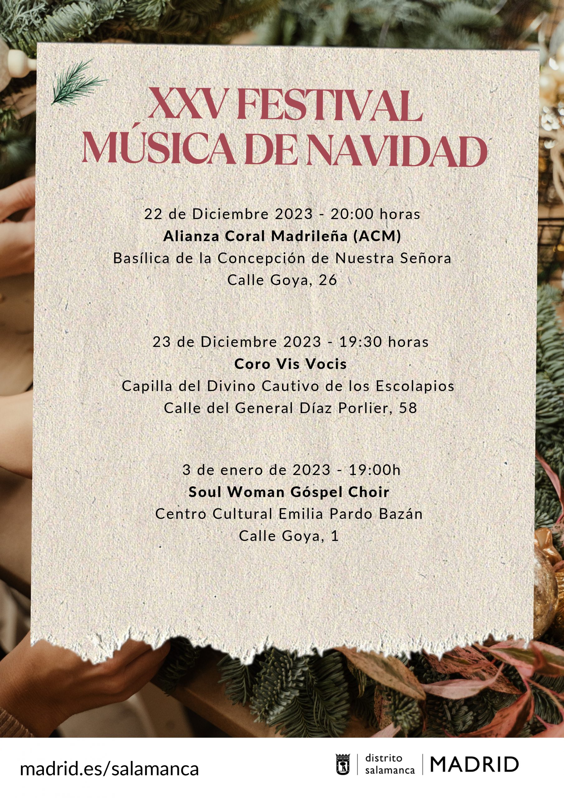 El miércoles 3 de enero, el XXV Festival de Música de Navidad concluirá en las instalaciones del Centro Cultural Emilia Pardo Bazán (calle Goya, 1). A partir de las 19:00 h y tras la presencia de los Reyes Magos de Oriente en sus instalaciones, serán despedidos con la música de Soul Woman Gospel Choir.