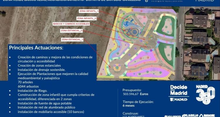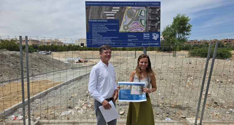 El concejal delegado de Limpieza y Zonas Verdes, José Antonio Martínez Páramo, y la concejala de San Blas-Canillejas, Almudena Maíllo, han visitado hoy las obras para la creación de un nuevo parque en el barrio de Rejas, en la parcela existente entre la calle de Yécora y la de Fuencemillán. Actualmente, se están realizando los trabajos de acondicionamiento y accesibilidad del futuro parque, que han supuesto una inversión de más de medio millón de euros con un proyecto que nace de una propuesta vecinal a través de los presupuestos participativos. Se espera que esta nueva zona verde esté disponible en el próximo otoño.