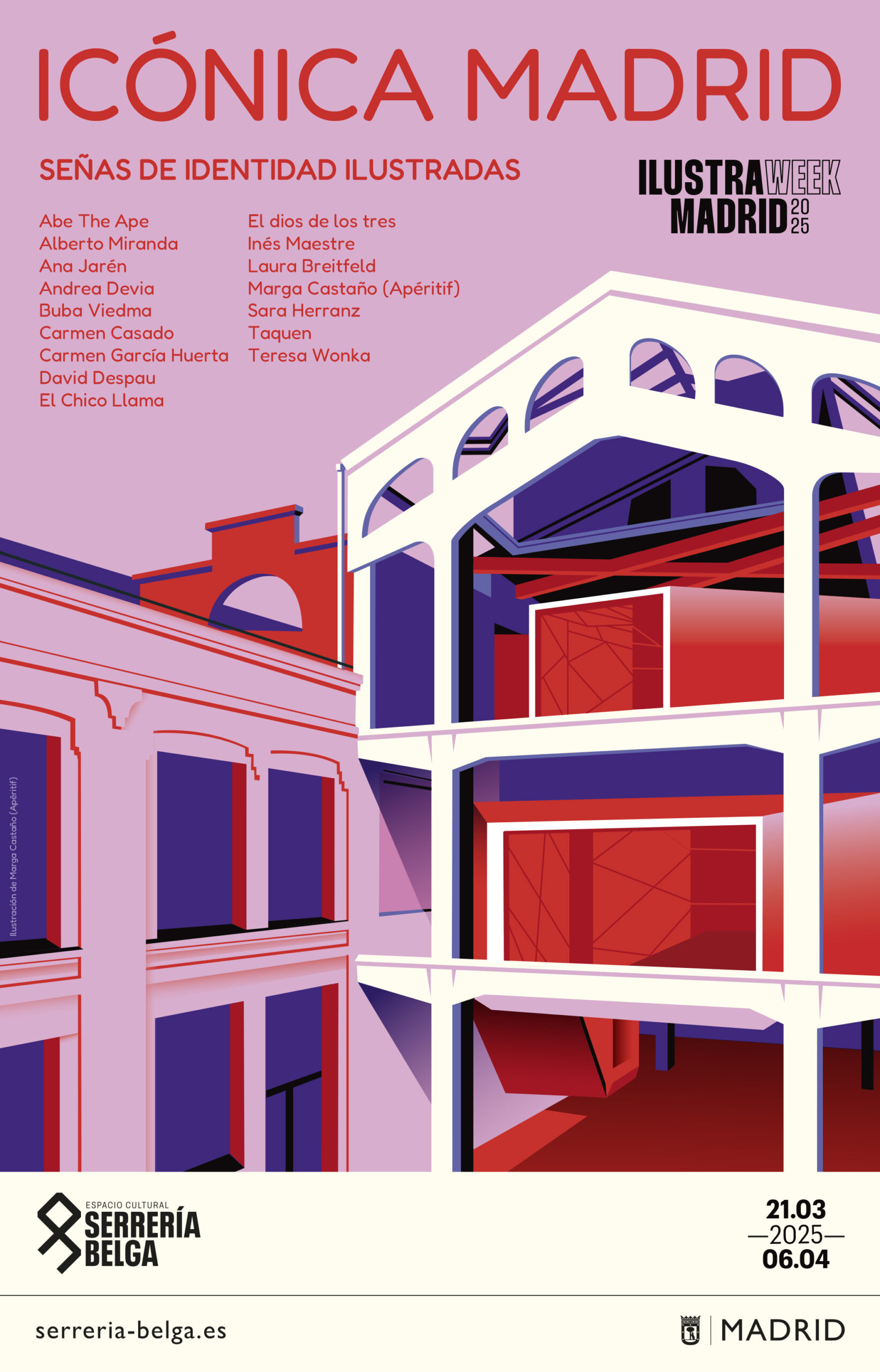 Icónica Madrid se podrá visitar hasta el próximo 20 de abril en el patio de Serrería Belga, que se transforma en una sala expositiva al aire libre para mostrar las obras de Abe The Ape, Alberto Miranda, Andrea Devia, Ana Jarén, Buba Viedma, Carmen Casado, Carmen García Huerta, David Despau, El Chico Llama, El Dios de los Tres, Inés Maestre, Laura Breitfeld, Marga Castaño, Sara Herranz, Taquen y Teresa Wonka. La exposición incluye piezas inéditas en gran formato que evidencian que la ilustración es un arte vivo y versátil.