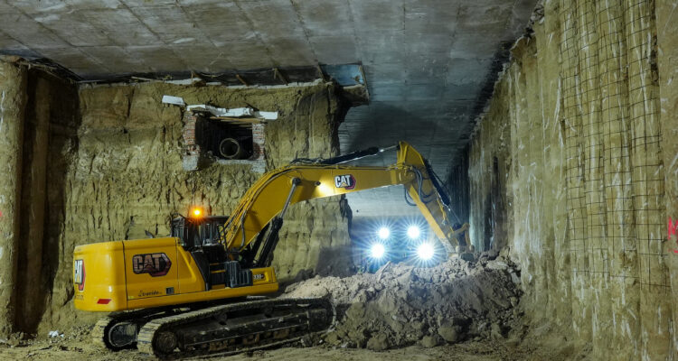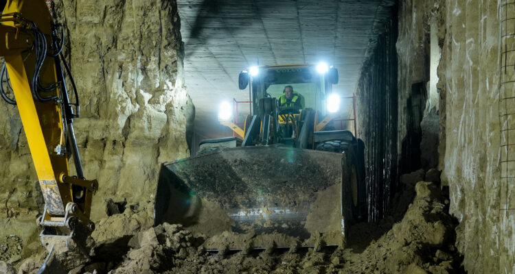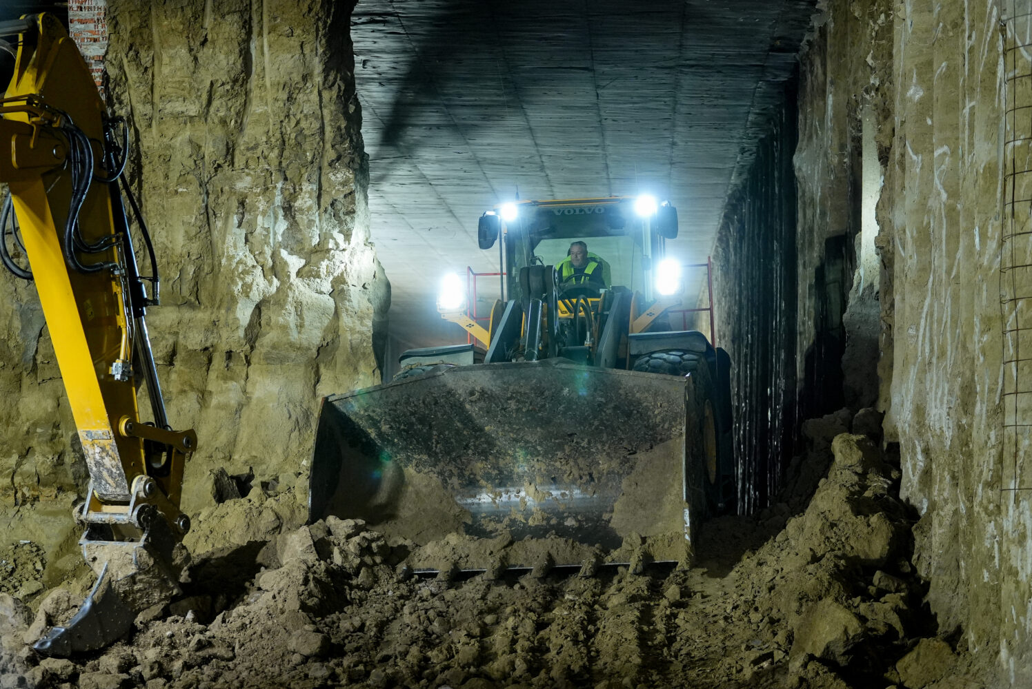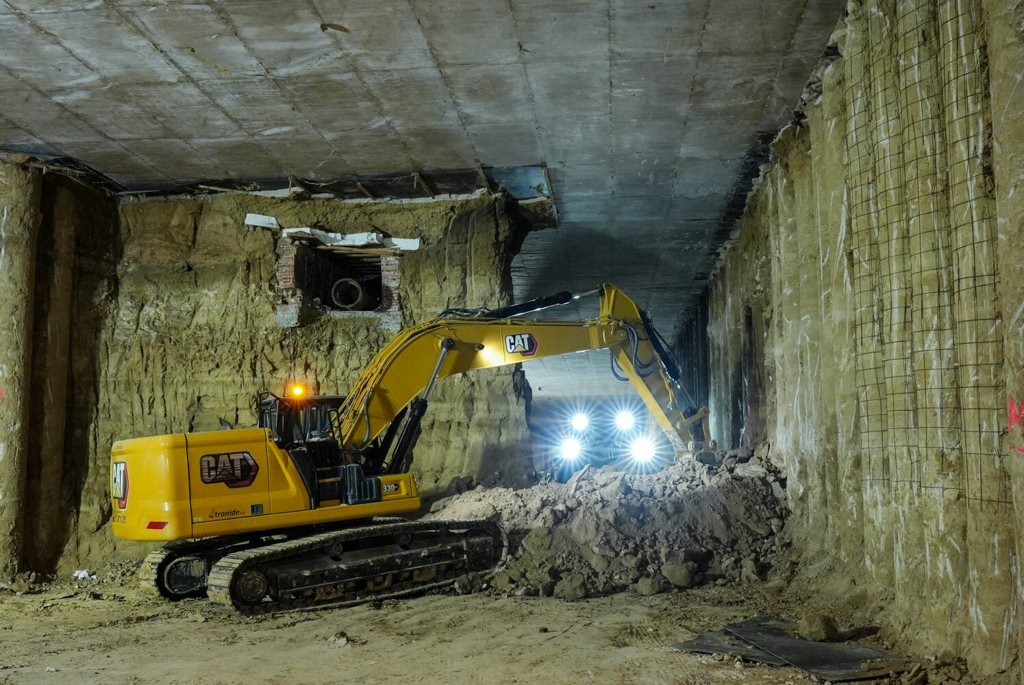 Operarios y maquinaria en la conexión de dos galerías excavadas en las obras de soterramiento de la A5