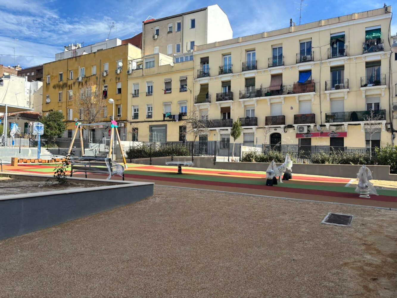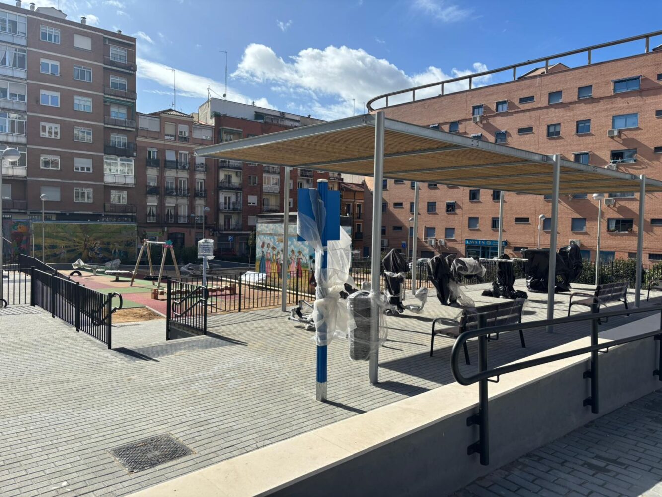 La segunda fase ha añadido cinco aparatos nuevos en el área infantil, dos de ellos adaptados: un columpio, bloques de equilibrio, un caballo móvil, un balancín y una redonda saltarina. También se han pavimentado cerca de 300 m2 y se han colocado ocho aparcabicicletas y dos bancos, así como una barandilla con doble pasamanos y tres nuevos sombreretes para ventilación del aparcamiento subterráneo. Asimismo, en ambas fases de las obras se han plantado nuevos arbustos y se han remodelado las zonas ajardinadas. /