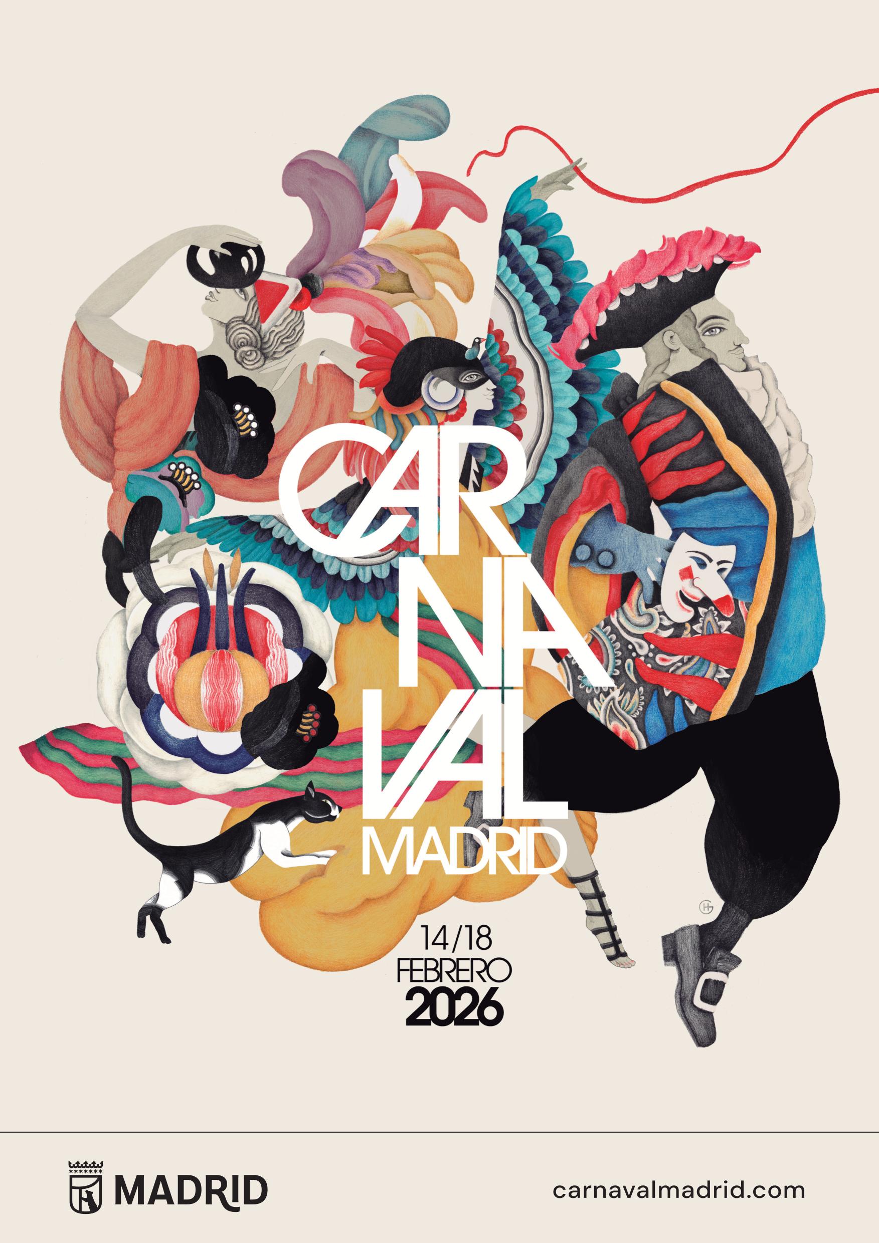Madrid se coloca la máscara para dar la bienvenida al Carnaval 2026. Del 14 al 18 de febrero, la ciudad se rendirá a la celebración de don Carnal, con el tradicional desfile y diversas actividades y actuaciones musicales organizadas por el Área de Cultura, Turismo y Deporte, que tendrán su epicentro en Madrid Río y Matadero Madrid. La ilustradora madrileña Carmen García Huerta ha sido la encargada de diseñar el cartel que desde hoy vestirá las calles de la capital.