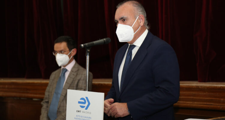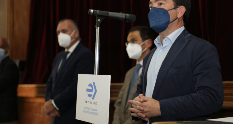 El delegado de Medio Ambiente y Movilidad, Borja Carabante, y el director gerente de la Empresa Municipal de Transportes de Madrid (EMT), Alfonso Sánchez, han participado en el acto de clausura del curso de formación de 44 nuevos conductores de autobús que se incorporarán a sus puestos de trabajo mañana martes, 1 de junio. Tal y como anunció el alcalde de Madrid, Jose Luis Martínez-Almeida, dentro de la Estrategia de Sostenibilidad Ambiental Madrid 360, en este año 2021 se realizarán 163 contrataciones de nuevos conductores.