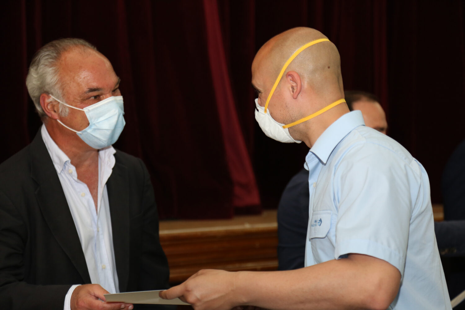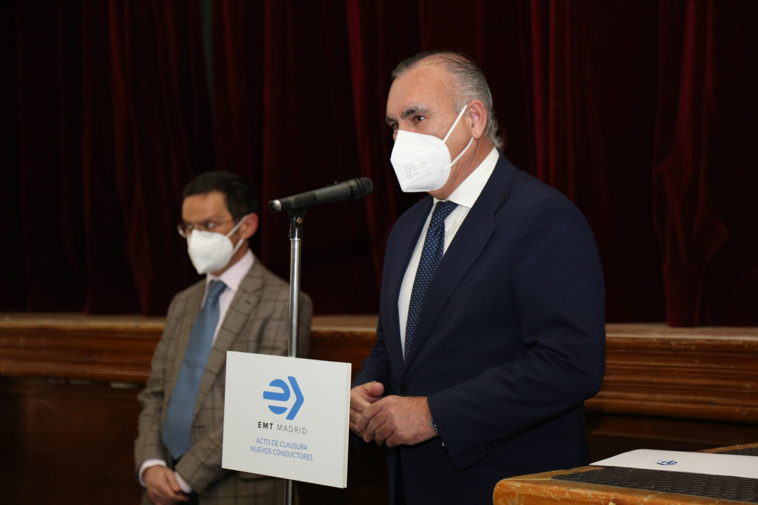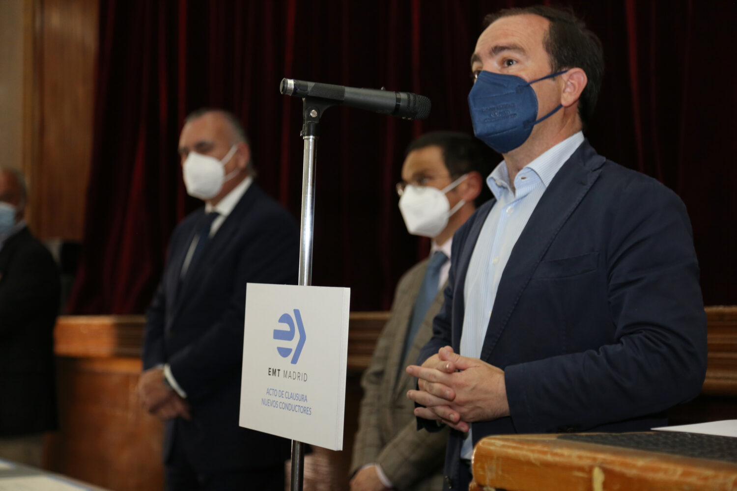 El delegado de Medio Ambiente y Movilidad, Borja Carabante, y el director gerente de la Empresa Municipal de Transportes de Madrid (EMT), Alfonso Sánchez, han participado en el acto de clausura del curso de formación de 44 nuevos conductores de autobús que se incorporarán a sus puestos de trabajo mañana martes, 1 de junio. Tal y como anunció el alcalde de Madrid, Jose Luis Martínez-Almeida, dentro de la Estrategia de Sostenibilidad Ambiental Madrid 360, en este año 2021 se realizarán 163 contrataciones de nuevos conductores.