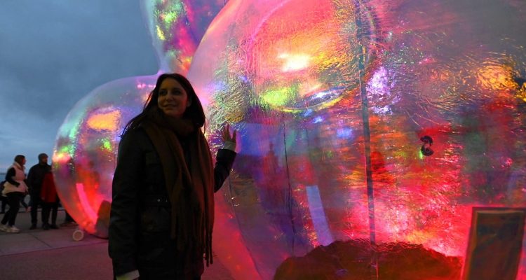 Evanescent utiliza luz natural y artificial para crear un espectáculo dinámico de coreografía colorida. Grandes burbujas cubiertas con una película diacrónica, funcionan como un lienzo, capturando los rayos de luz desde todos los ángulos y descomponiéndolos en diferentes colores. A medida que el sol brilla, la película se refracta, creando orgánicamente un jardín de esferas iridiscentes. Por la noche, la instalación cambia y las proyecciones de luz rebotan dentro de la capa reflectante de las esferas creando una experiencia completamente nueva.