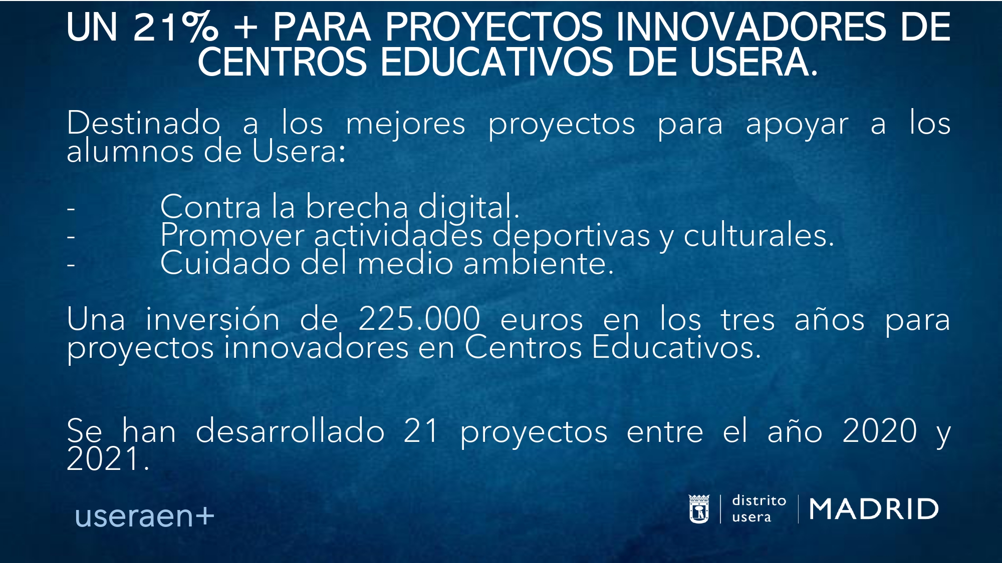 La Junta Municipal de Usera invertirá este año 85.000 euros en proyectos de innovación en centros educativos del distrito, lo que supone un incremento del 21 % respecto al año pasado. En total, Usera habrá destinado 225.000 euros en tres años a proyectos innovadores que aporten valor añadido a la oferta educativa existente.