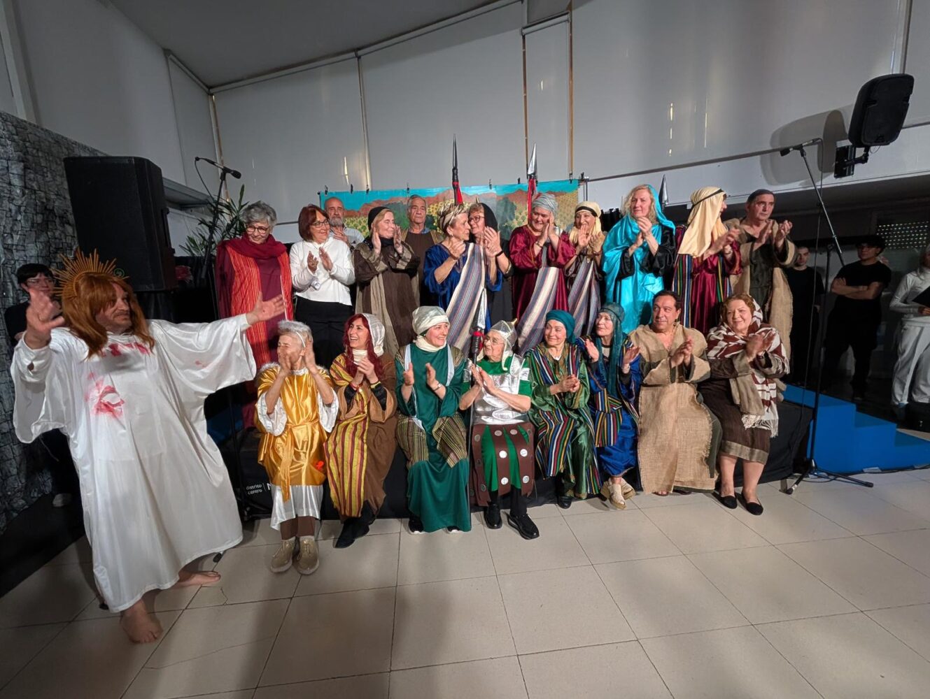 El elenco de actores ha dado vida a personajes como los doce apóstoles, Barrabás, Jesús, María, María Magdalena, un ángel, el Cireneo, el sumo sacerdote y Poncio Pilato, además de las voces de dos narradores. El vestuario ha sido confeccionado por Tomasa Benito, una socia voluntaria con amplia experiencia en la creación de trajes para teatro y compañías de danza que ha trabajado para firmas de prestigio como Cornejo o Tamayo, entre otras. La Unidad Distrital de Colaboración de Centro Arcópoli se ha encargado de la elaboración de los decorados y la coral Voces del Barrio ha puesto música a la representación. /