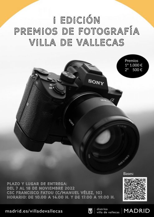 La Junta Municipal de Villa de Vallecas ha convocado la primera edición de los Premios de Fotografía Villa de Vallecas 2022 a la que podrán concurrir todas las personas físicas, mayores de edad, residentes en la Comunidad de Madrid presentando sus obras fotográficas en el Centro Sociocultural Francisco Fatou, del 7 al 18 de noviembre de 2022, en horario de 10:00 a 14:00 h y de 17:00 a 19:00 h.