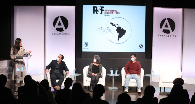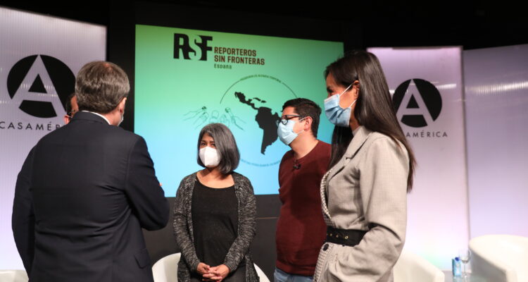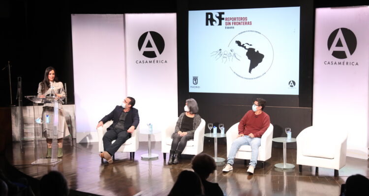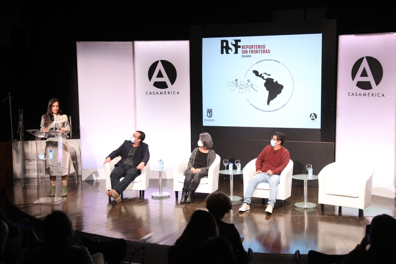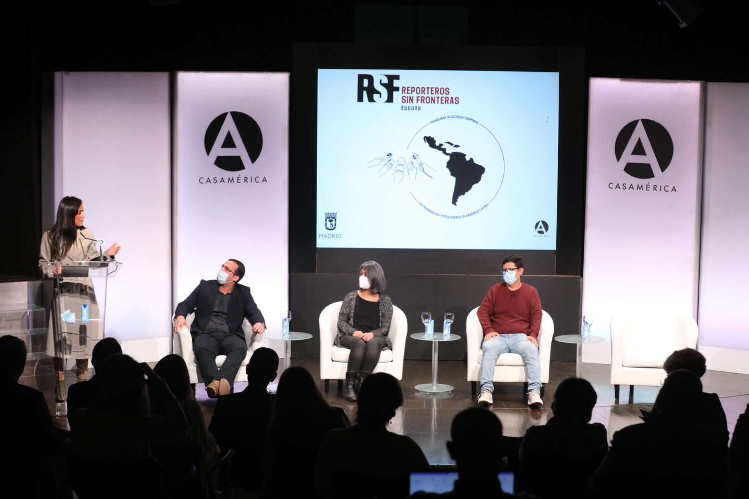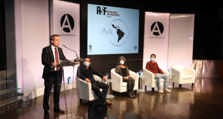 Óscar Javier Parra, María Teresa Montaño, Waldo Fernández y Tania López son periodistas latinoamericanos que viven en sus respectivos países amenazados por ejercer su profesión y que ahora pasarán tres meses en Madrid, alejados de los conflictos y el estrés, gracias al programa de Acogida Temporal de Periodistas Latinoamericanos. La vicealcaldesa, Begoña Villacís, acompañada del concejal delegado de Internacionalización y Cooperación, Santiago Saura, ha presentado hoy en Casa de América la cuarta edición de este programa financiado por el Ayuntamiento de Madrid y coordinado por la ONG Reporteros Sin Fronteras (RSF).