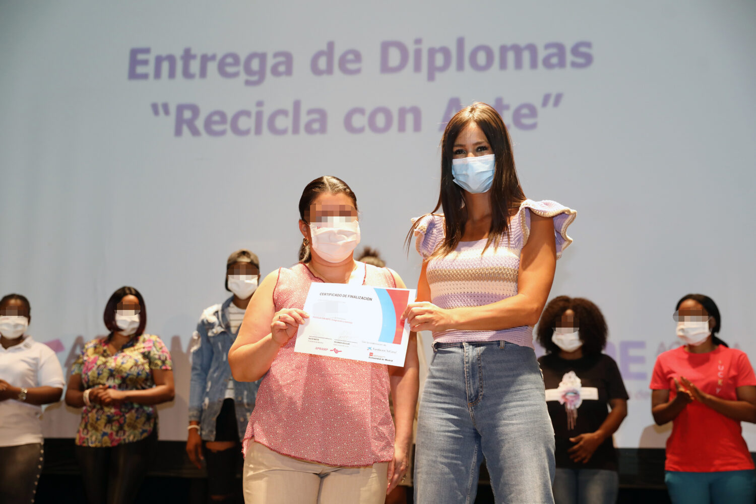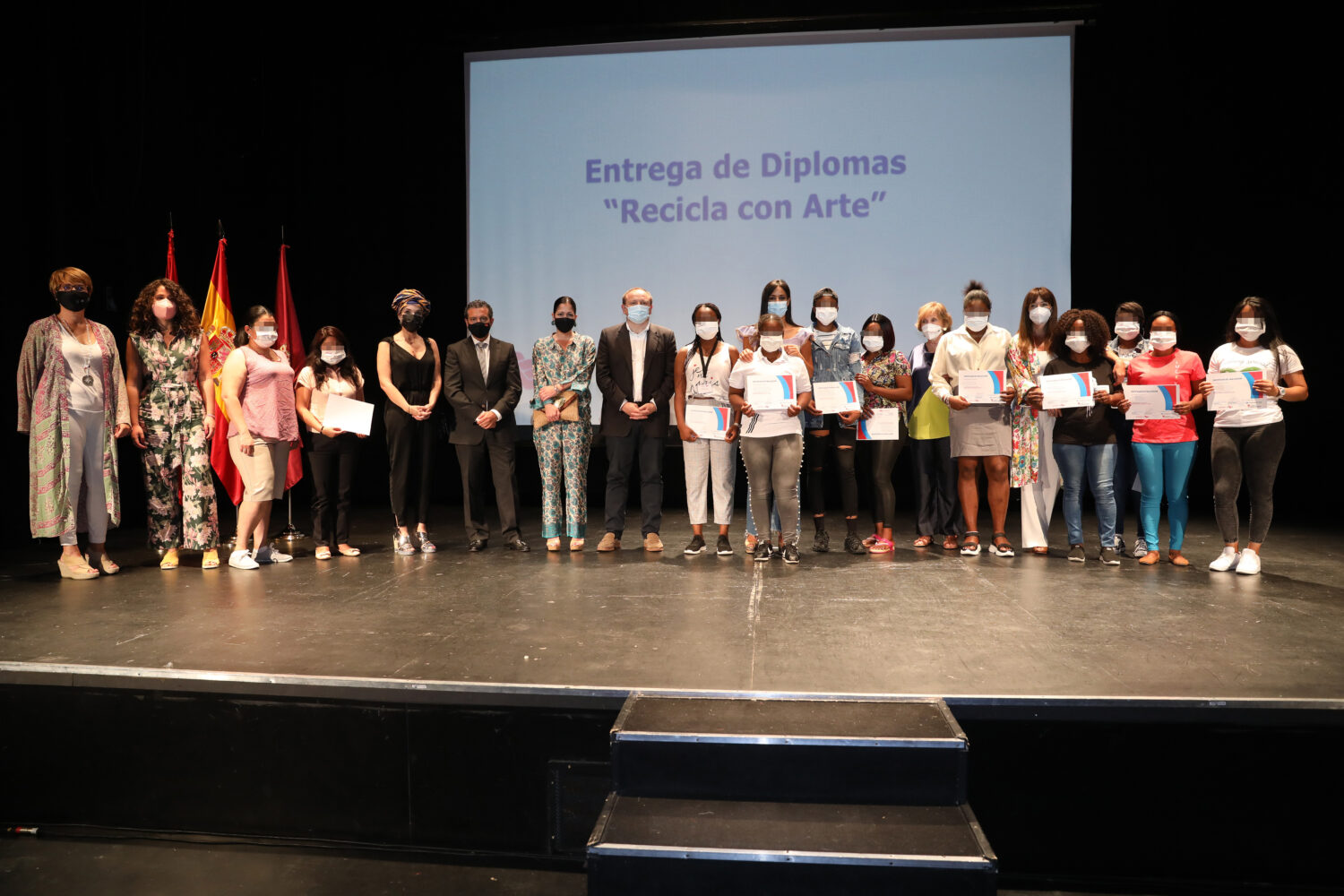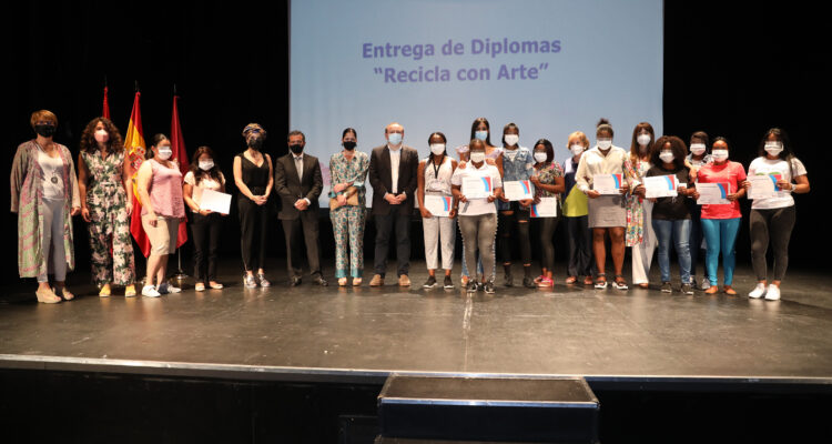 La vicealcaldesa de Madrid, Begoña Villacís, acompañada del delegado de Economía, Innovación y Empleo y presidente de la Agencia para el Empleo, Miguel Ángel Redondo, y del delegado de Familias, Igualdad y Bienestar Social, Pepe Aniorte, ha entregado hoy, en el Centro Cultural Eduardo Úrculo, los diplomas del taller ‘Recicla con Arte. Integración y reciclaje’, organizado por la Agencia para el Empleo, desarrollado por la Asociación Para la Prevención, Reinserción y Atención a la Mujer Prostituida (APRAMP) y becado por la Fundación La Caixa.