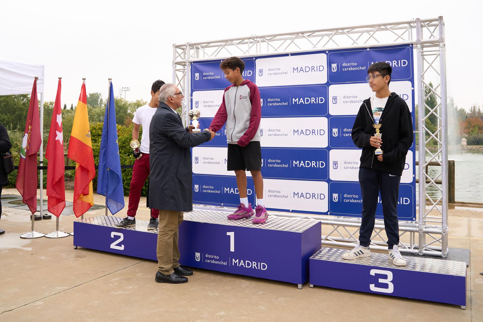 El concejal Carlos Izquierdo entregando los trofeos a los ganadores del cross escolar sobre un podio de Madrid