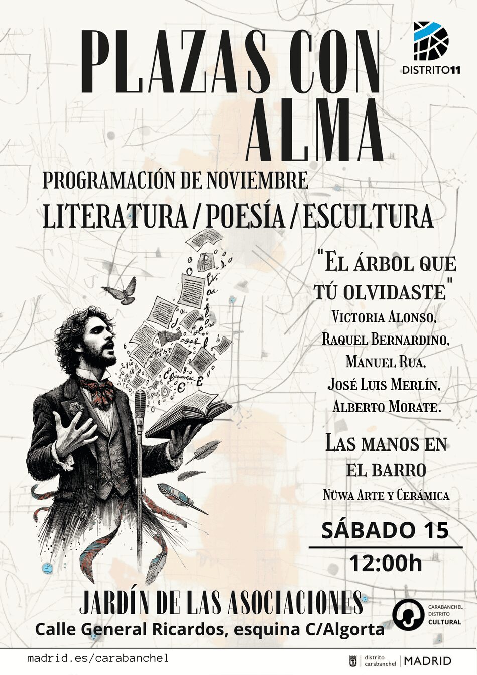 El sábado 22 (nueva fecha), en el Jardín de las Asociaciones organizarán una muestra de literatura y esculturas con el recital El árbol que tú olvidaste y la exposición ‘Las Manos en el Barro’. Este evento reunirá a talentos como la escritora Victoria Alonso y la poeta Raquel Bernardino, acompañadas por Manuel Rúa (voz), José Luis Merlín (guitarra) y la colaboración de Alberto Morate, junto a las obras de NüWa Arte y Cerámica. Será a las 12:00 h.