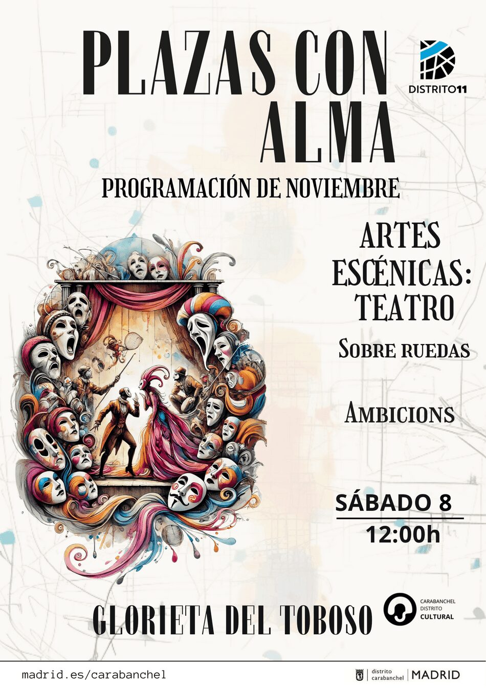El teatro en la Glorieta del Toboso se estrenará el mismo sábado con las obras Sobre Ruedas y Ambicions. Desde las 12:00 h con esta doble sesión de teatro al aire libre para el público general.
