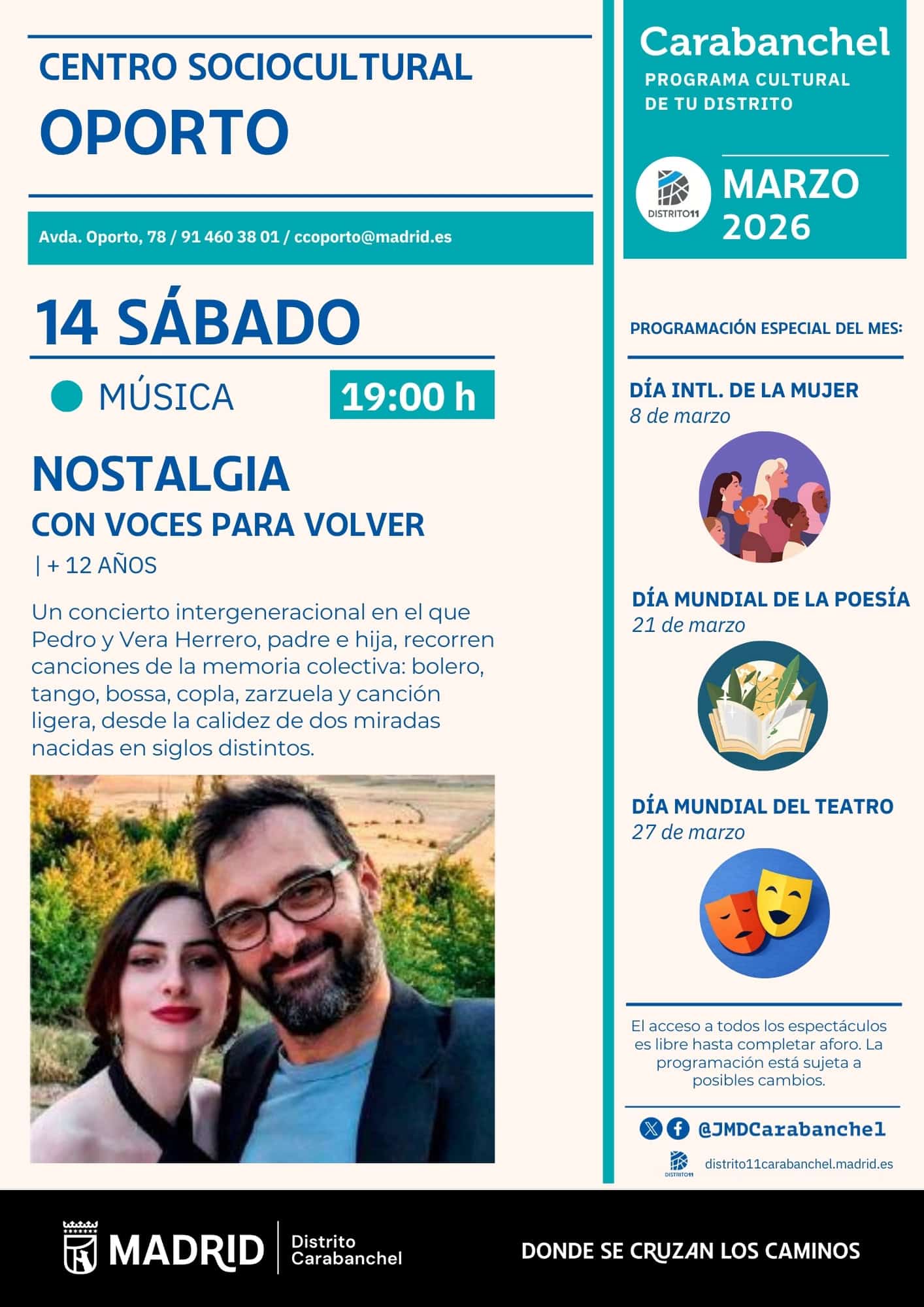 Voces para volver ofrece un concierto intergeneracional en el que padre e hija recorren canciones del mundo como boleros, tangos, bossas o coplas entre otros géneros. Pedro y Vera Herrero comparten escenario para celebrar esas voces que nos acompañan “desde siempre”.