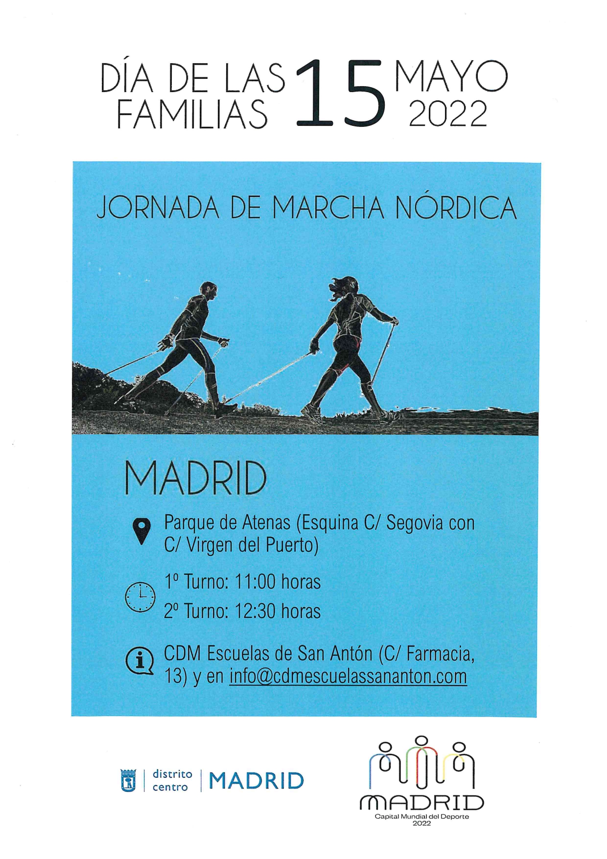 Con motivo del Día de las Internacional de las Familias, el 15 de mayo, la Junta Municipal de Centro organiza una Jornada de marcha nórdica. La actividad, de carácter gratuito, se llevará a cabo en el parque de Atenas, con inicio en la esquina de la calle de Segovia con Virgen del Puerto.