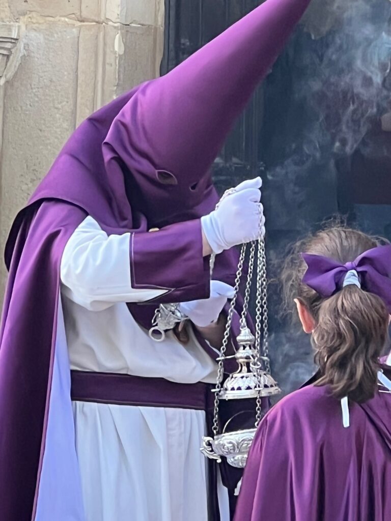 La vestimenta de los nazarenos incluye: túnica morada, faja de esparto ancha, antifaz morado con cruz trinitaria en el pecho, guantes blancos, alpargatas negras de esparto y medias negras de esparto.