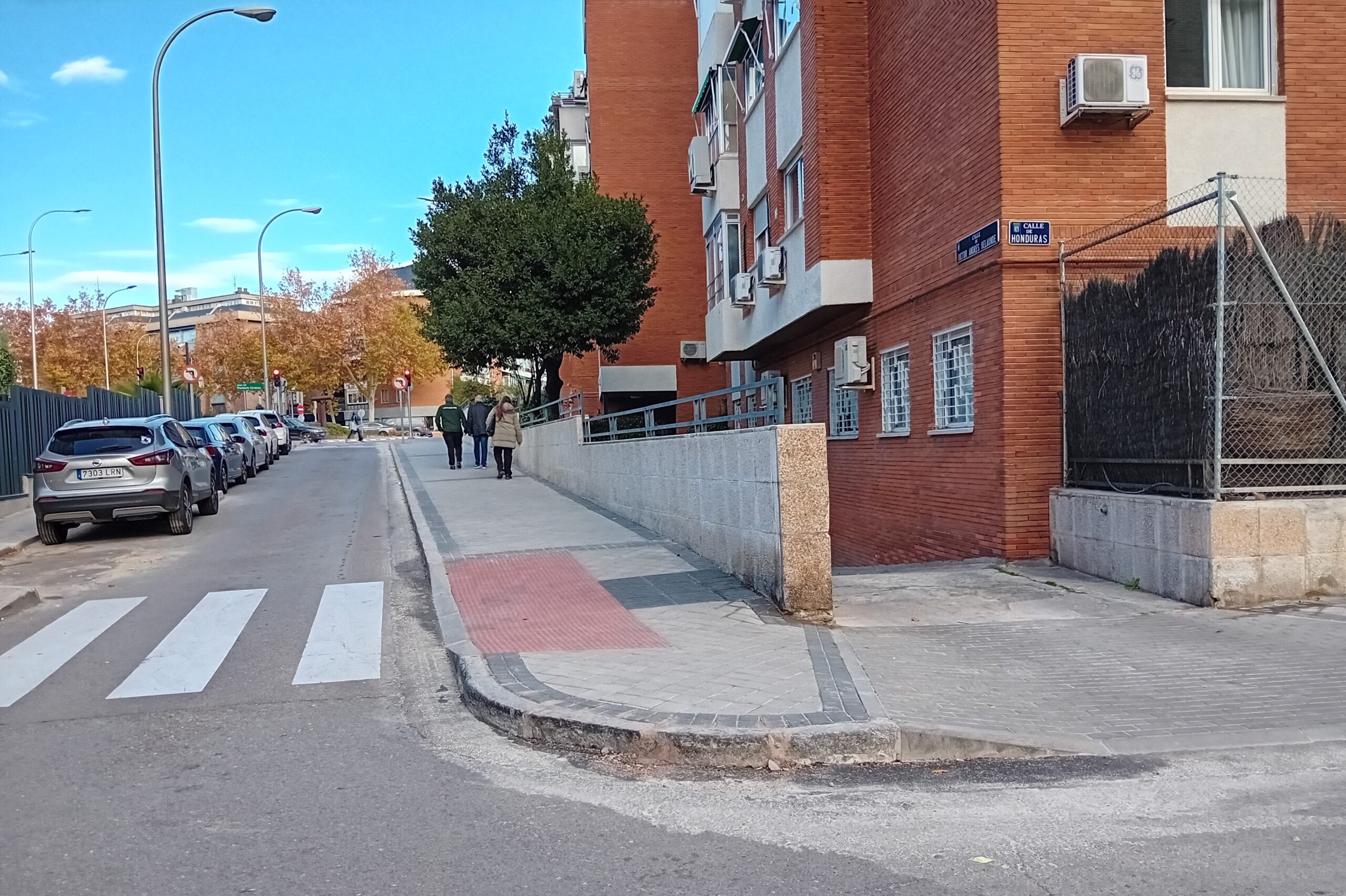 Mejorar la accesibilidad, garantizar unas entradas y salidas más despejadas e insistir en itinerarios escolares seguros. Estos han sido los principales objetivos de la rehabilitación de la calle de Honduras que se han traducido en cinco mejoras ya visibles en el entorno y en una que está por llegar.