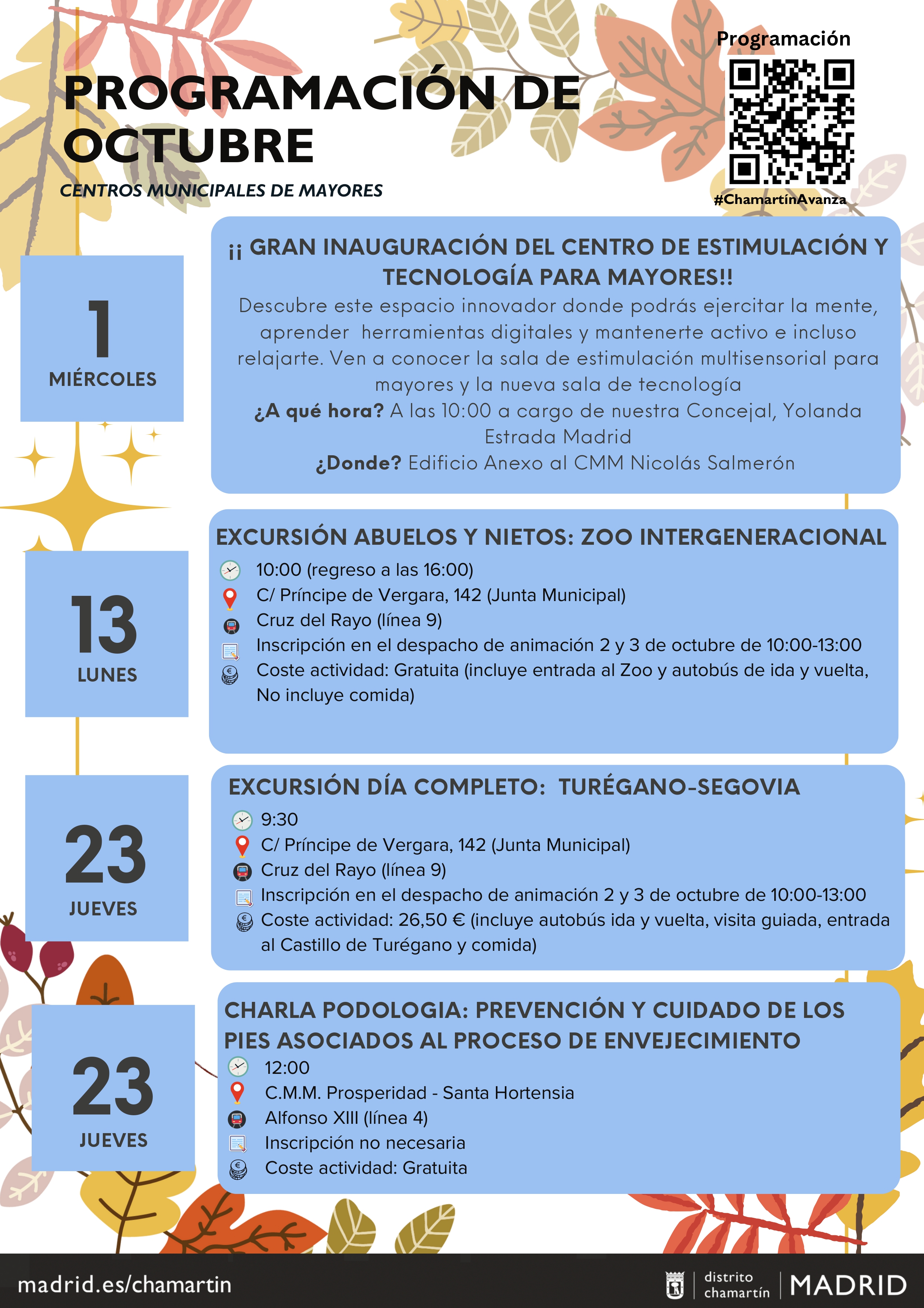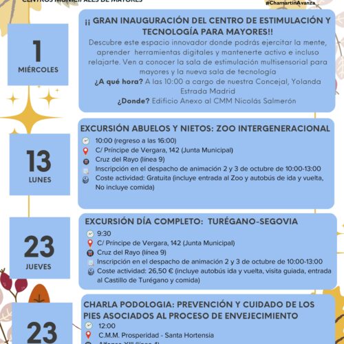 El mes de octubre ha arrancado con una gran noticia para los mayores de Chamartín tras la inauguración del Centro de Estimulación y Tecnología ubicado en el edificio anexo al Centro Municipal de Mayores Nicolás Salmerón, que permitirá a los usuarios realizar talleres intensivos sobre competencias digitales y tener un espacio donde relajarse. Además, para estrenar la temporada de otoño, los CMM del distrito han preparado una programación que incluye excursiones, charlas y talleres. Te lo contamos: