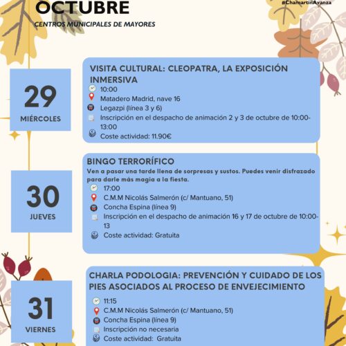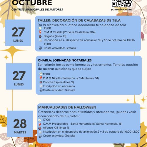 Los talleres de este mes se centro en la fiesta de Halloween. El lunes 27 en el Centro Municipal de Mayores Castilla darán la bienvenida al otoño con un taller de decoración de calabazas de tela. Para esta actividad gratuita es necesario inscribirse en el despacho de animación, el 16 y 17 de octubre de 10:00 a 13:00 h.