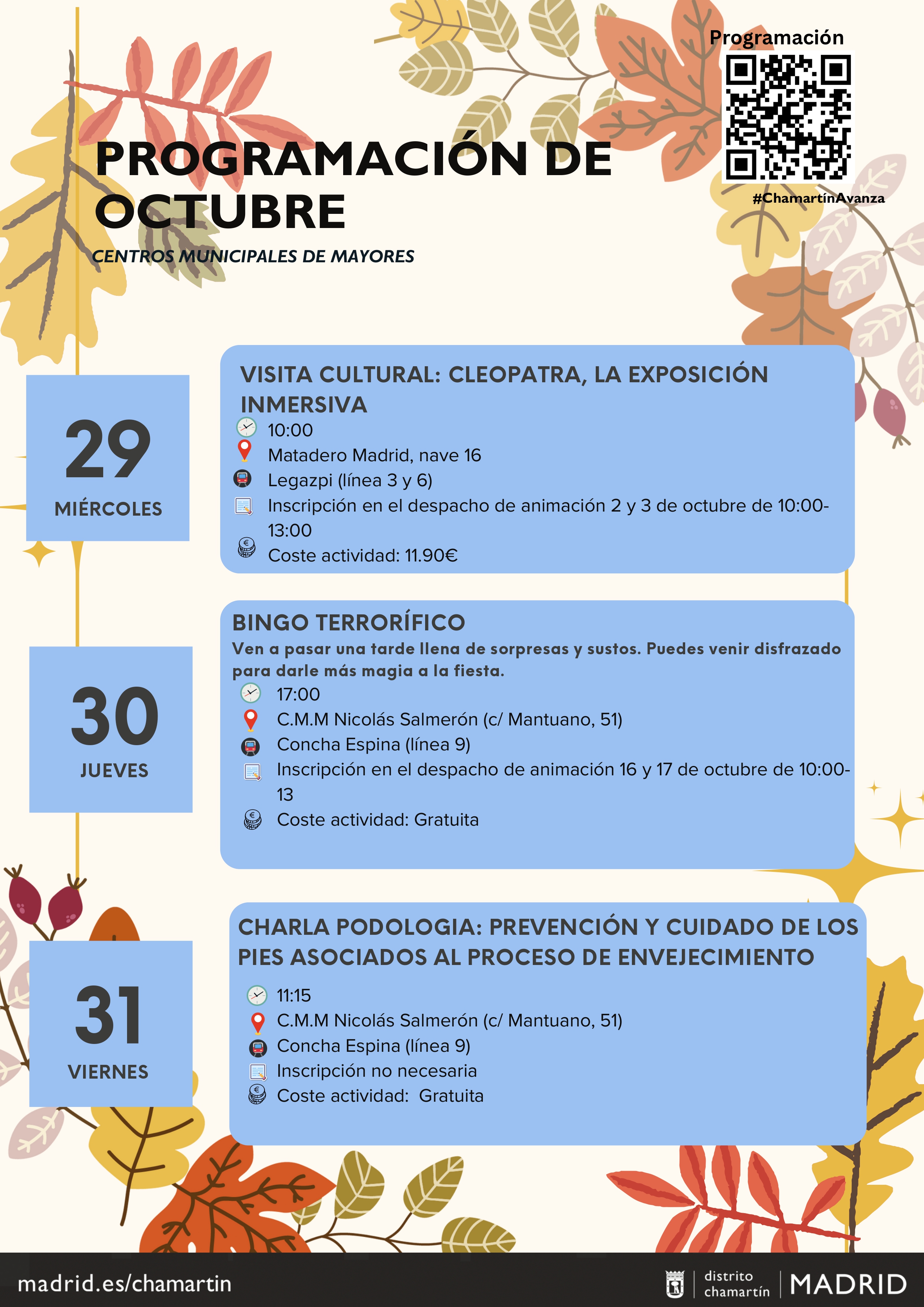 Por último, el jueves 30, se celebrará en el CMM Nicolás Salmerón un bingo terrorífico a las 17:00 h, previa inscripción en el despacho de animación, el 16 y 17 de octubre de 10:00 a 13:00 h. ¡Puedes venir con tu disfraz!