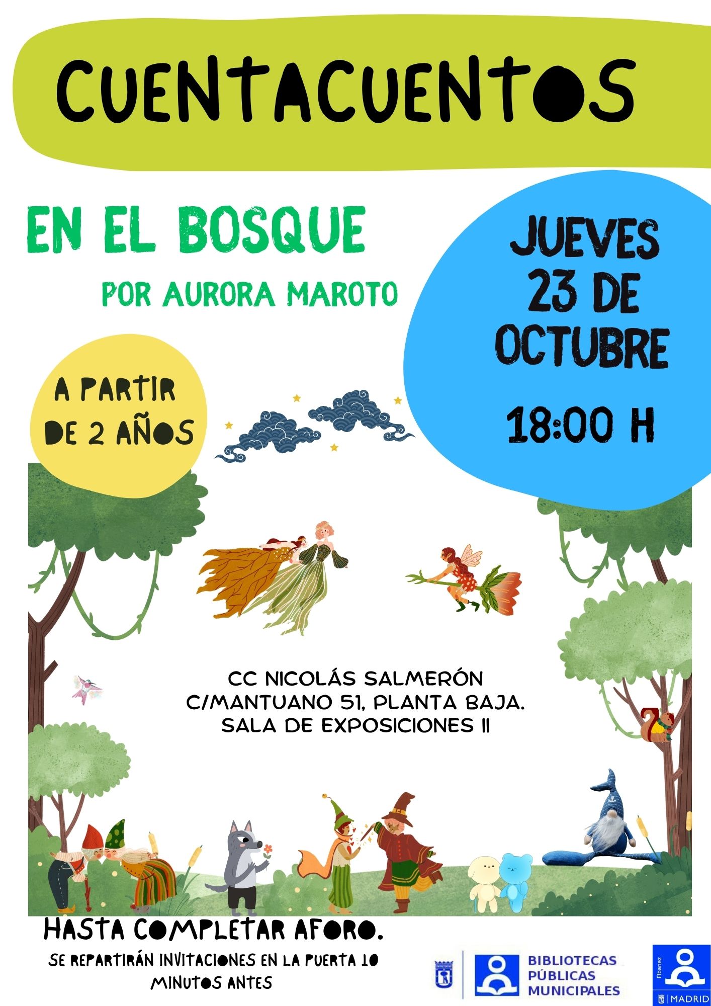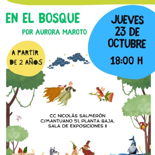 El jueves 23 de octubre está lleno de actividades en el centro de la calle Mantuano, 51. En la sala de exposiciones II celebrarán la sesión de cuentacuentos En el bosque, por Aurora Maroto. Está dirigida para niños a partir de dos años y comenzará a las 18:00 h. La entrada es libre hasta completar aforo.