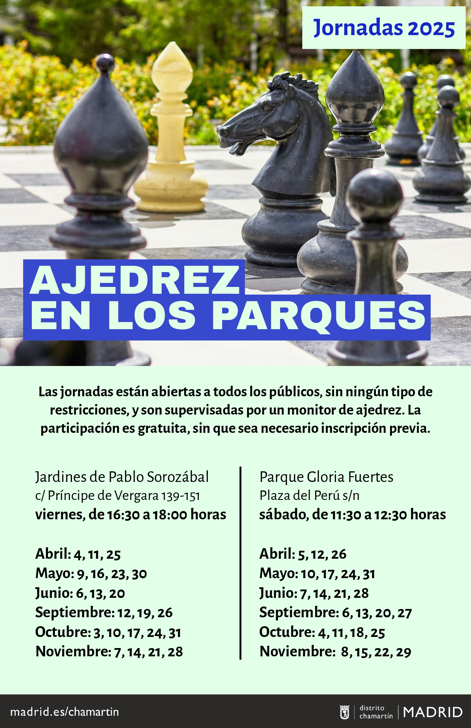 Los tableros gigantes de Chamartín te esperan un fin de semana más con las clases abiertas de ajedrez. El viernes, pásate por los Jardines de Pablo Sorozábal (c/ Príncipe de Vergara 139-151), de 16:30 a 18:00 h. Y si quieres jugar y aprender los sábados, te esperan en el Parque Gloria Fuertes (Plaza del Perú s/n), de 11:30 a 12:30 h.