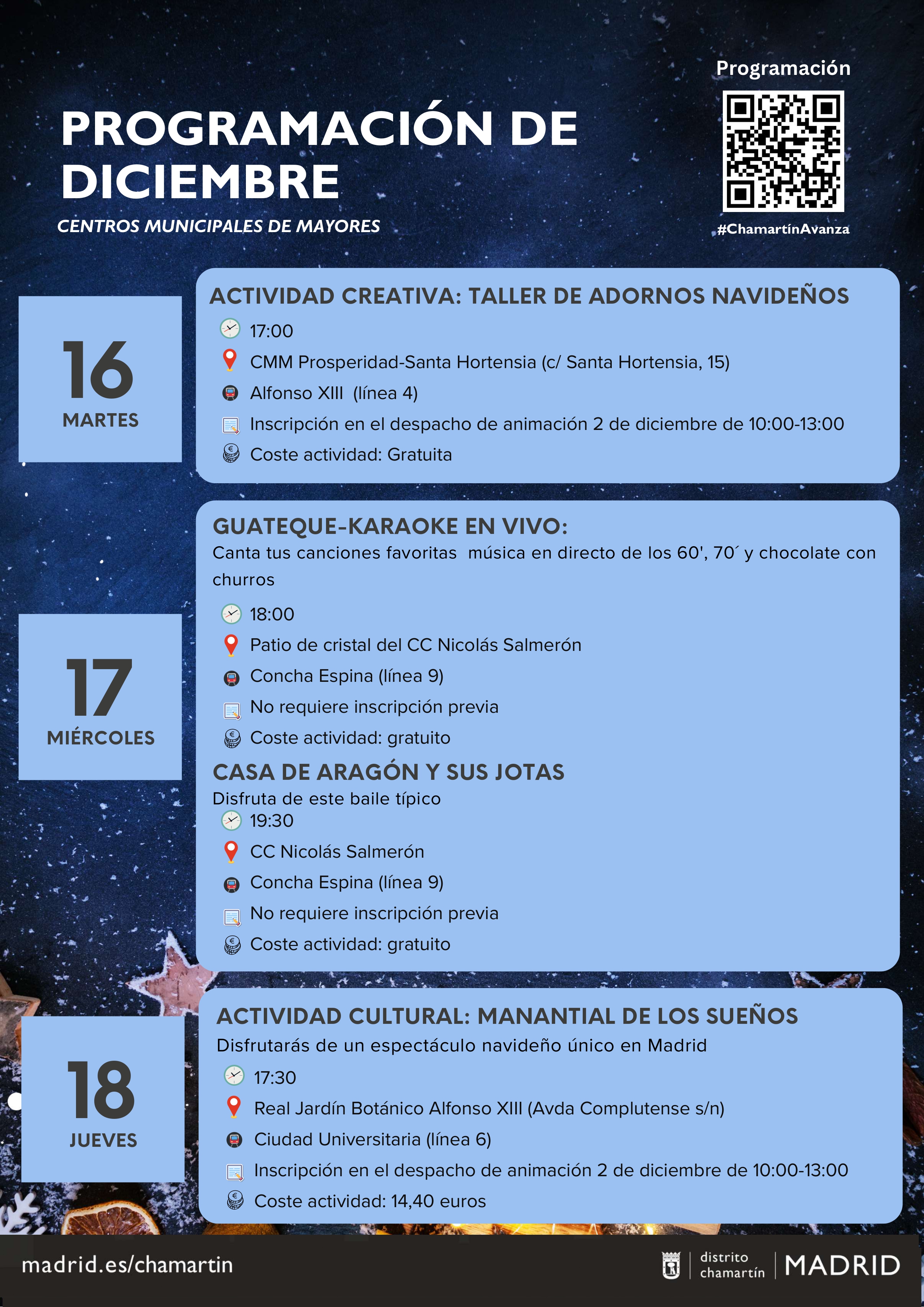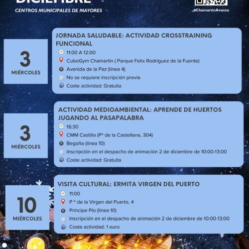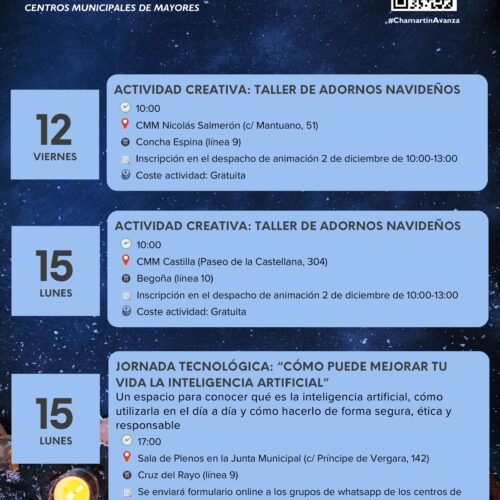 Las siguientes actividades a las que podrán apuntarse son la visita cultural a la Ermita de la Virgen del Puerto del día 10, el taller de adornos navideños que se impartirá en el CMM Nicolás Salmerón el viernes 12, en el CMM Castilla el lunes 15 y en el CMM Prosperidad-Santa Hortensia el martes 16.