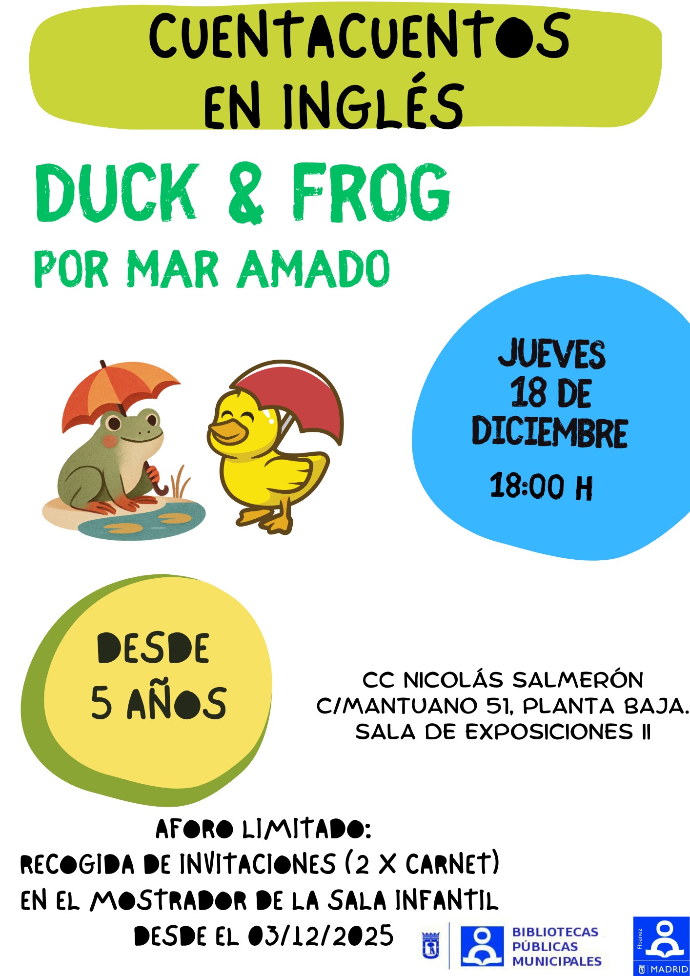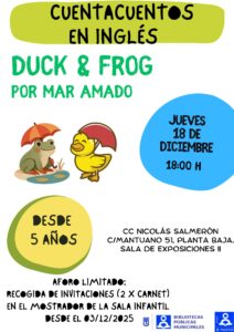 Después, el día 18, el centro acogerá la sesión de cuentacuentos en inglés Duck & Frog de la mano de Mar Amado. Desde 5 años, el jueves a las 18:00 h. Ya está abierto el plazo para recoger las invitaciones en el mostrador de la sala infantil del centro.