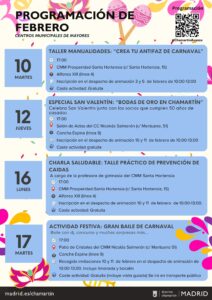 El martes 10, el CMM Prosperidad–Santa Hortensia organiza el taller de manualidades ‘Crea tu antifaz de carnaval’, a las 17:00 h. Para participar es necesario inscribirse en el despacho de animación los días 3 y 6 de febrero, de 10:00 a 13:00 h.