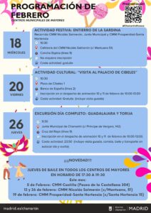 Como novedad, durante el mes de febrero se estrenan los Jueves de Baile en todos los centros, en horario de 17:30 a 19:30 h. El día 5 se celebrará en el CMM Castilla; los días 12 y 26, en el CMM Nicolás Salmerón; y el día 19, en el CMM Prosperidad–Santa Hortensia.