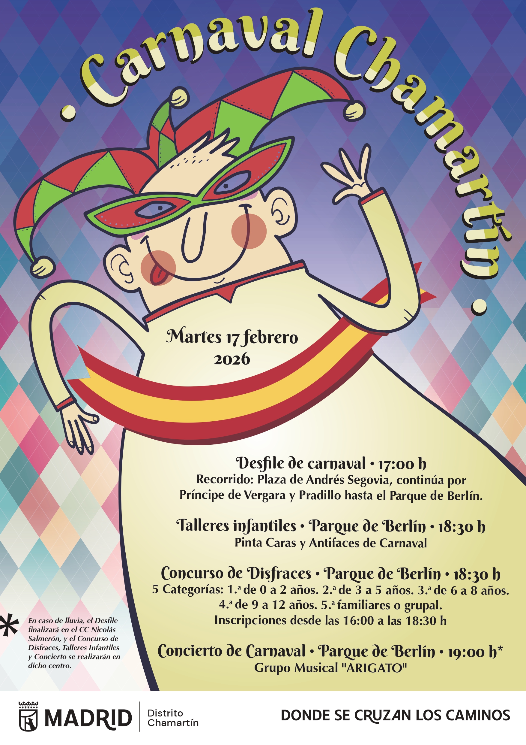 El Carnaval se celebra en Chamartín el martes, 17 de febrero, a las 17:00 h con el tradicional desfile que comenzará en la plaza de Andrés Segovia y continuará por las calles del Príncipe de Vergara y Pradillo hasta llegar al parque de Berlín.