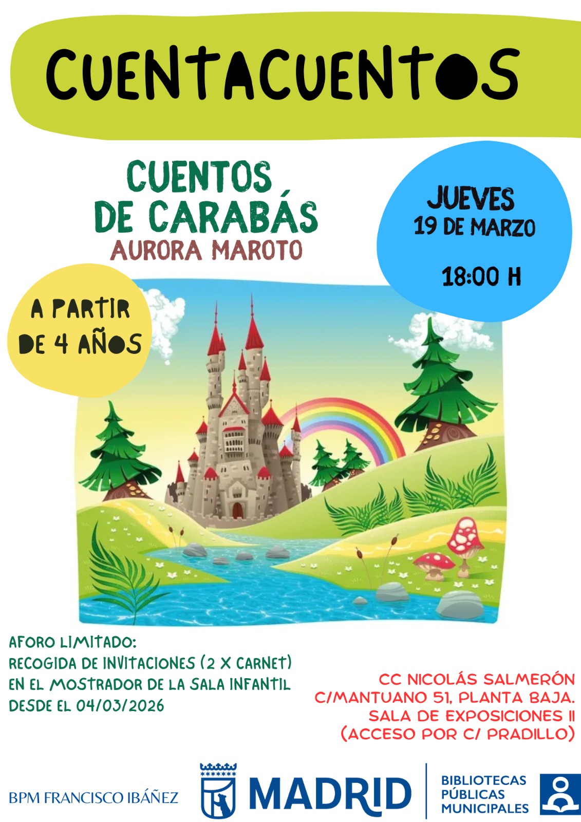 El jueves 19 a las 18:00 h, los vecinos de 2 a 4 años de Chamartín podrán disfrutar de los Cuentos de Carabás, de la mano de Aurora Maroto. El aforo es limitado y se pueden recoger dos invitaciones por carné.