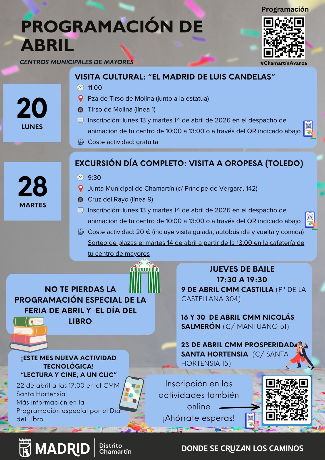 El programa incluye también una excursión de día completo a Oropesa el martes 28 de abril. La actividad, con salida desde la Junta Municipal de Chamartín, incluye transporte, visita guiada y comida por un precio de 20 euros. Debido a la alta demanda, las plazas se asignarán mediante sorteo el 14 de abril a partir de las 13:00 horas en la cafetería de cada centro. El plazo para apuntarse estará abierto del lunes 13 al martes 14 de abril, en el despacho de animación o a través de este enlace.