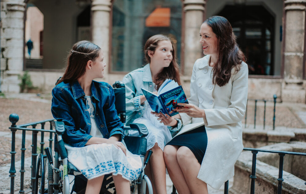 La leucodistrofia es una enfermedad rara. Hoy queremos dar voz a Carolina Plantinet, niña afectada por esta dolencia, y a su hermana Isabel, ambas vecinas de nuestro distrito. Isabel, con solo 9 años, publicó con la ayuda de su madre, Laura Rivera, su primer libro: Carolina Purpurina: Brillantes aventuras sobre ruedas, donde nos acerca la vida de su hermana, feliz pese a los obstáculos.