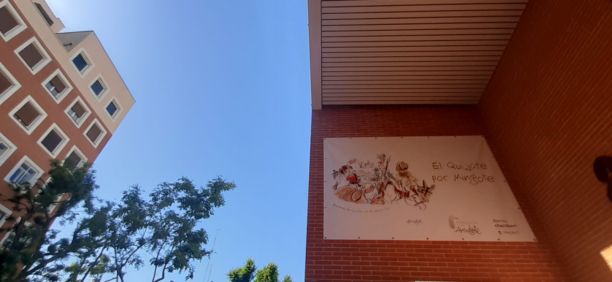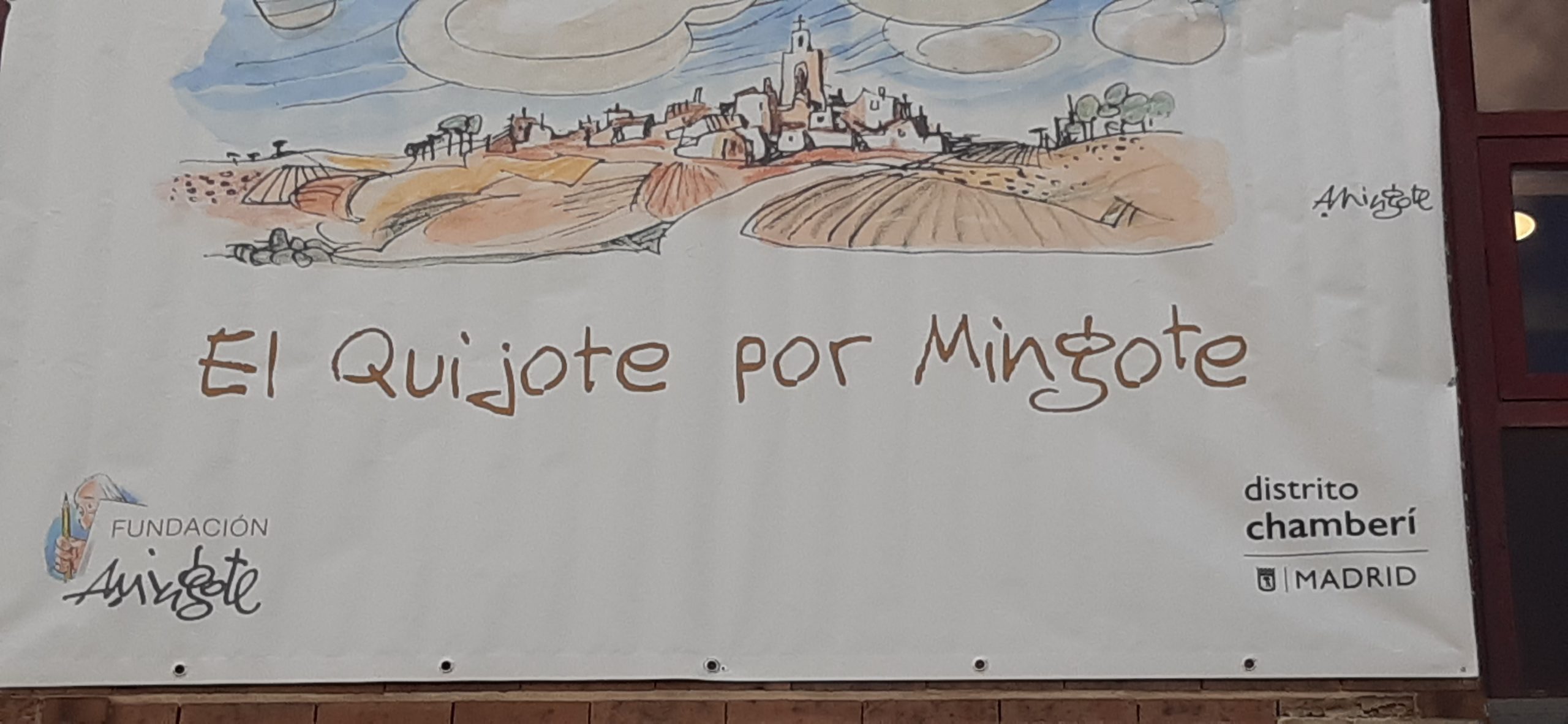 En el año 2005, el humorista gráfico Antonio Mingote cumplió uno de sus sueños, ilustrar la obra cumbre de Miguel de Cervantes: El Ingenioso Hidalgo Don Quijote de la Mancha. Treinta lonas con estas ilustraciones las puedes ver ya en las fachadas de los edificios públicos y educativos del distrito y las puedes disfrutar en tus paseos e itinerarios por Chamberí. Algunas ilustraciones hacen referencia a los pasajes más conocidos como Locura de Don Quijote o Don Quijote y los molinos de viento, pero también hay retratos como el de Cervantes, que puedes ver en la lona que pende del balcón de la sede de la Junta Municipal de Chamberí.