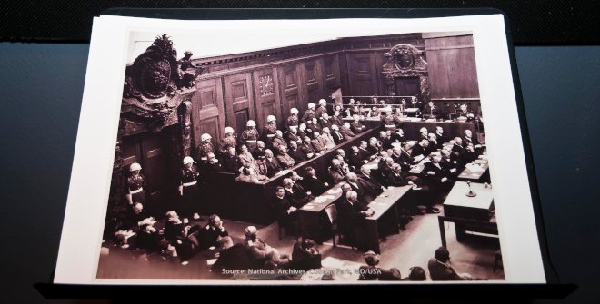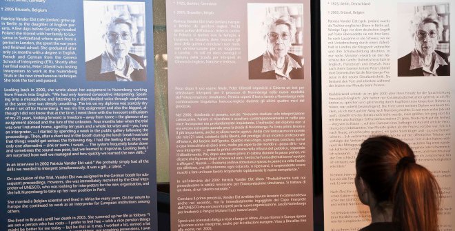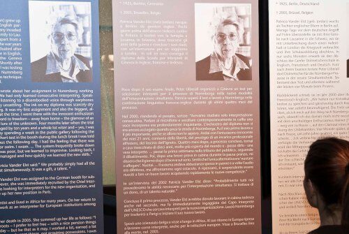 La exhibición se torna, de este modo, en homenaje al audaz equipo de 36 intérpretes que se instaló en cabinas protegidas por placas de vidrio, dotadas de un sistema de auriculares, micrófonos y cables, e hizo posible que la humanidad conociese y, lo que es aún más importante, que el tribunal pudiera juzgar, las atrocidades cometidas por el régimen que dirigió Adolf Hitler. Se dictaron sentencias sobre 117 crímenes, 12 de los 22 acusados fueron condenados a muerte, siete a penas de prisión y tres quedaron absueltos. Además, el servicio de interpretación y su sistema de relevos, cabinas y combinación lingüística han servido como modelo base para el Tribunal Penal Internacional de La Haya (Países Bajos), además de proporcionar el impulso definitivo a una profesión que no dejaría de crecer desde entonces.