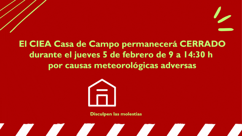 El Centro de Información y Educación Ambiental Casa de Campo permanecerá cerrado el jueves 5 de febrero de 9:00 a 14:30 horas por causas meteorológicas adversas, en virtud del protocolo de alertas meteorológicas del Ayuntamiento de Madrid aplicable a situaciones de alerta roja (y extrapolable a la Casa de Campo).