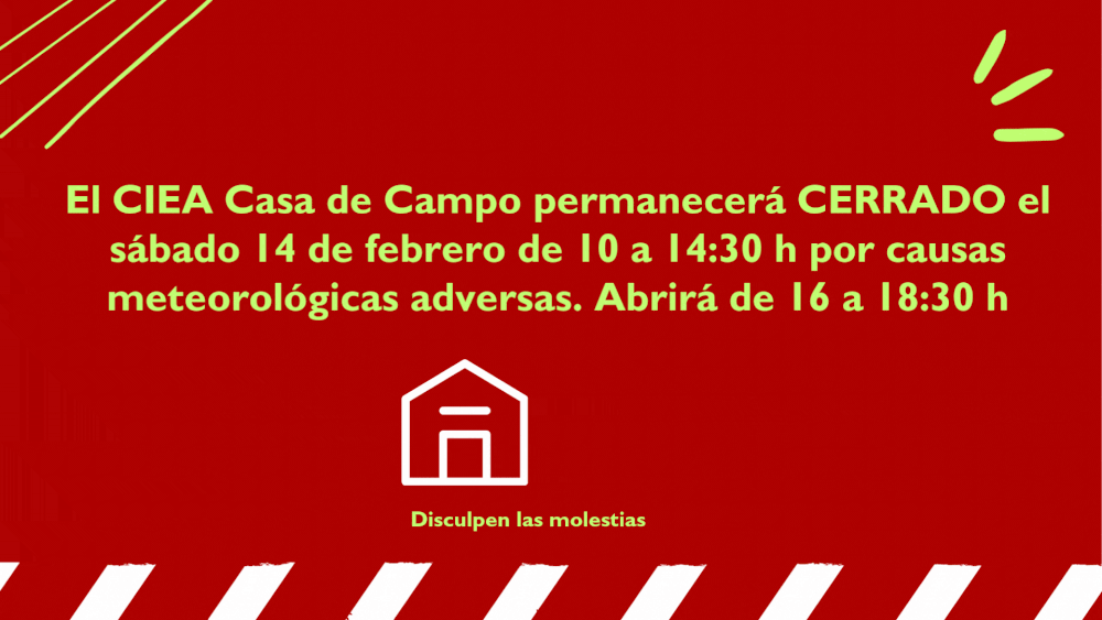 El Centro de Información y Educación Ambiental Casa de Campo permanecerá cerrado el sábado 14 de febrero, de 10:00 a 14:30 horas, por causas meteorológicas adversas, en aplicación del protocolo de alertas meteorológicas del Ayuntamiento de Madrid para situaciones de alerta roja (y extrapolable a la Casa de Campo).