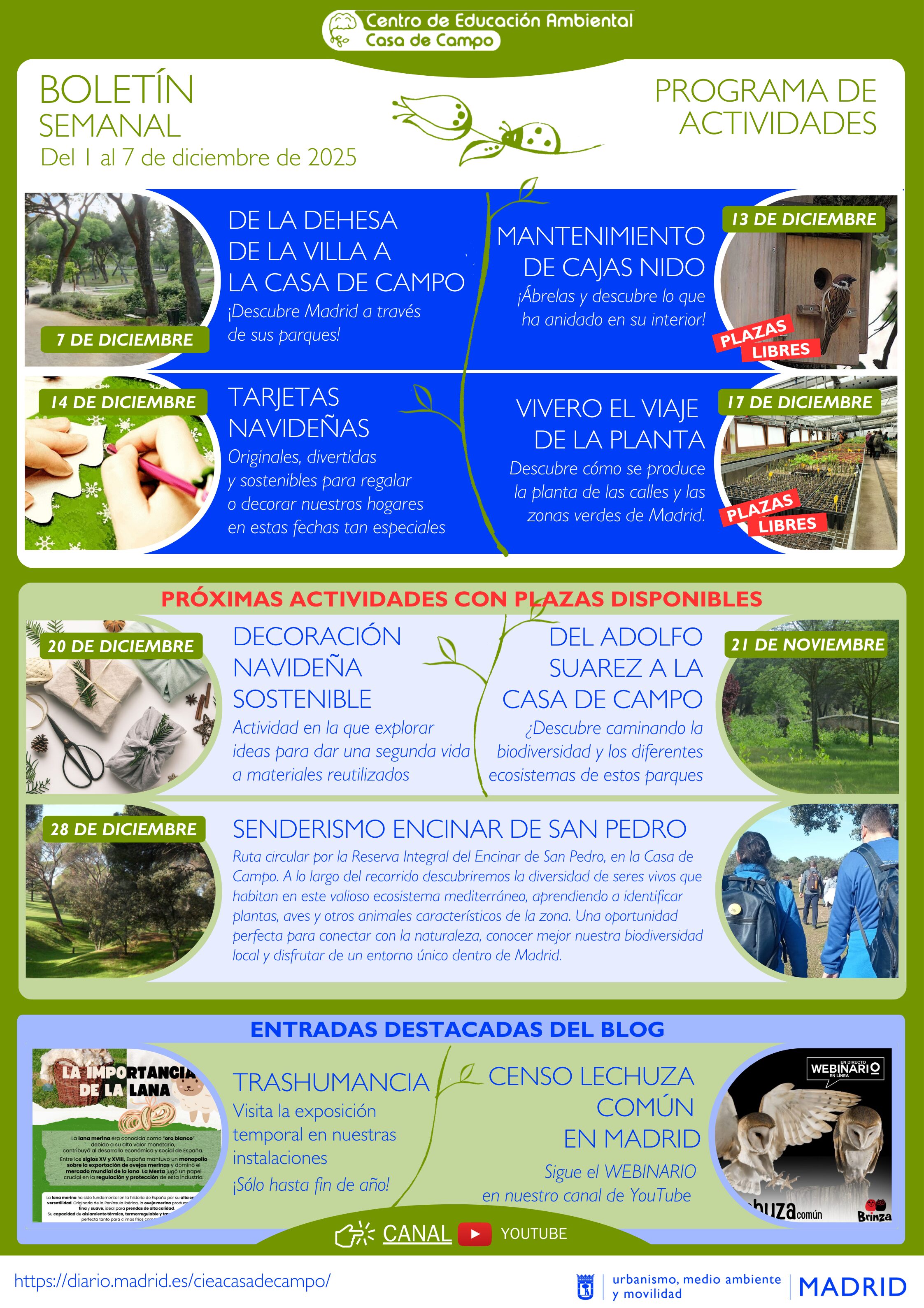 Como cada semana publicamos el BOLETÍN donde os proponemos las actividades ofertadas a través del programa educativo del CIEA Casa de Campo.