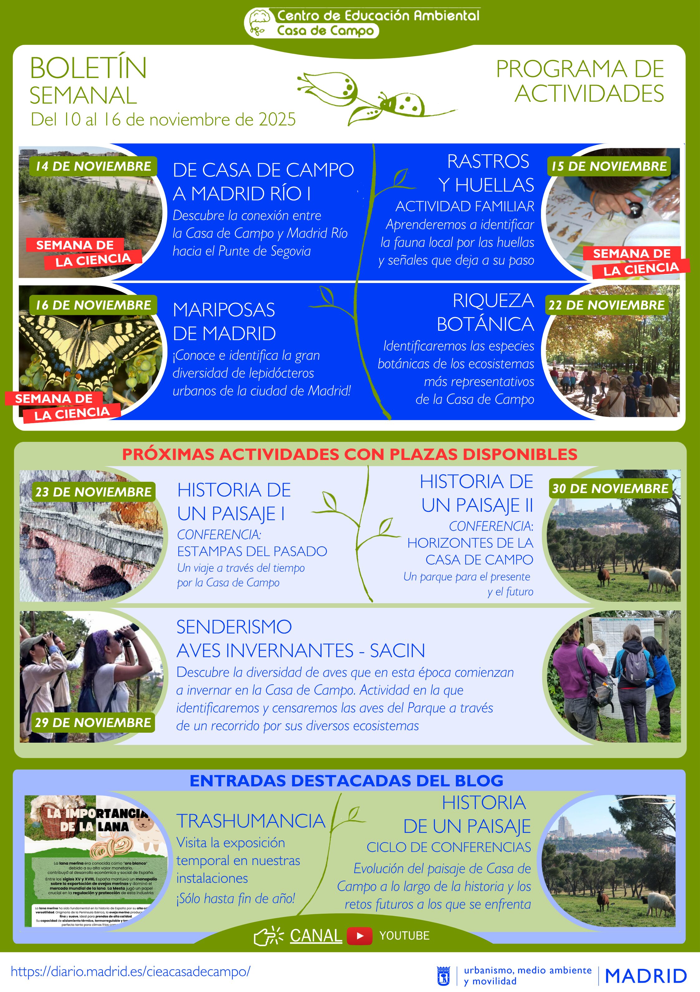 • Con letra azul: otras actividades para las que aún quedan PLAZAS LIBRES y que podéis reservar enviando un correo electrónico a: infocasacampo@madrid.es (recordamos la normativa de inscripción en el presente enlace).