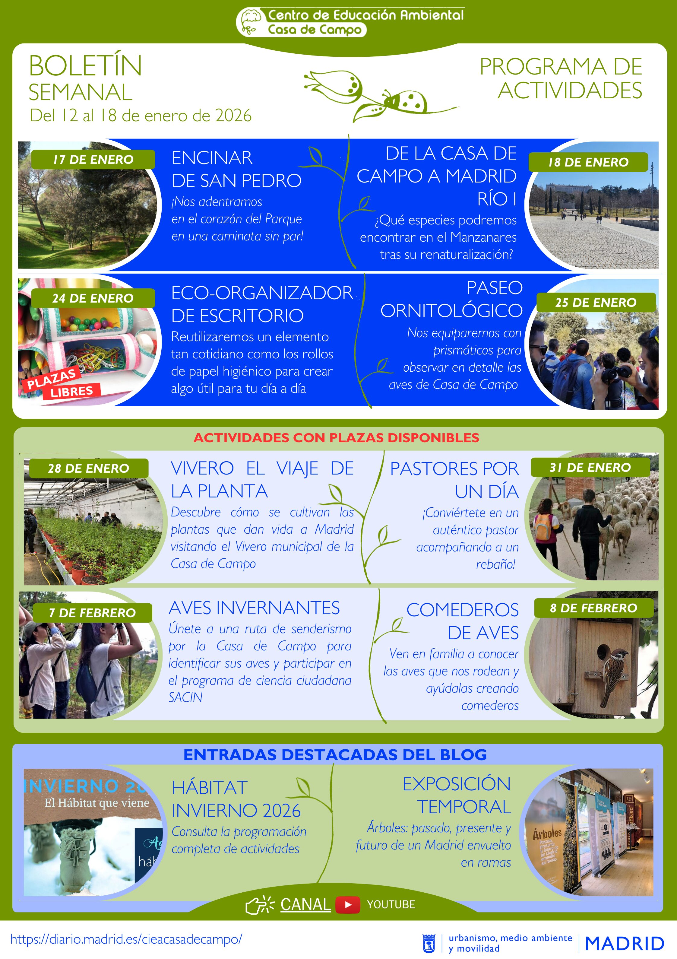 Como cada semana publicamos el BOLETÍN donde os proponemos las actividades ofertadas a través del programa educativo del CIEA Casa de Campo.