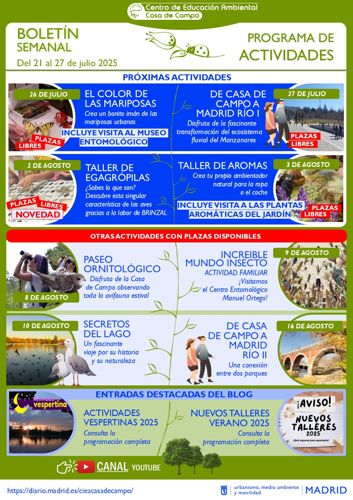 • Con letra azul: otras actividades para las que aún quedan PLAZAS LIBRES y que podéis reservar enviando un correo electrónico a: infocasacampo@madrid.es (recordamos la normativa de inscripción en el presente enlace).
