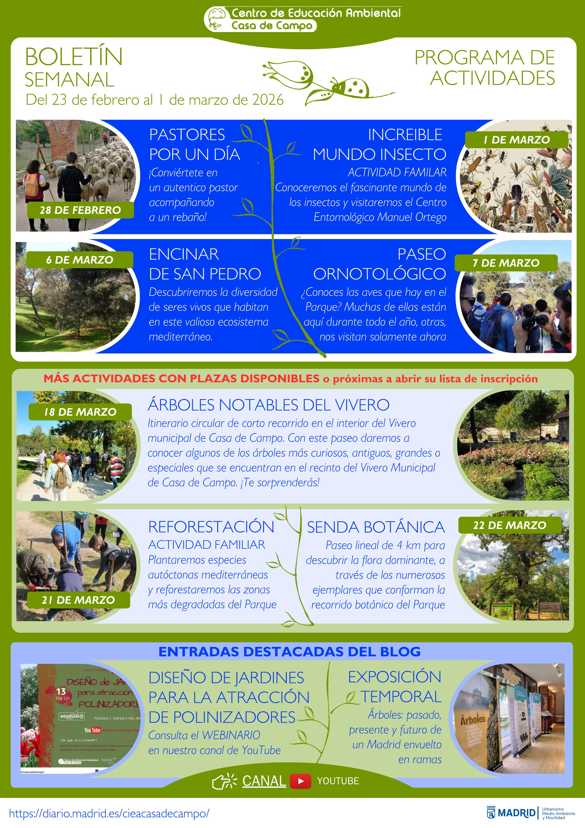 Como cada semana publicamos el BOLETÍN donde os proponemos las actividades ofertadas a través del programa educativo del CIEA Casa de Campo.