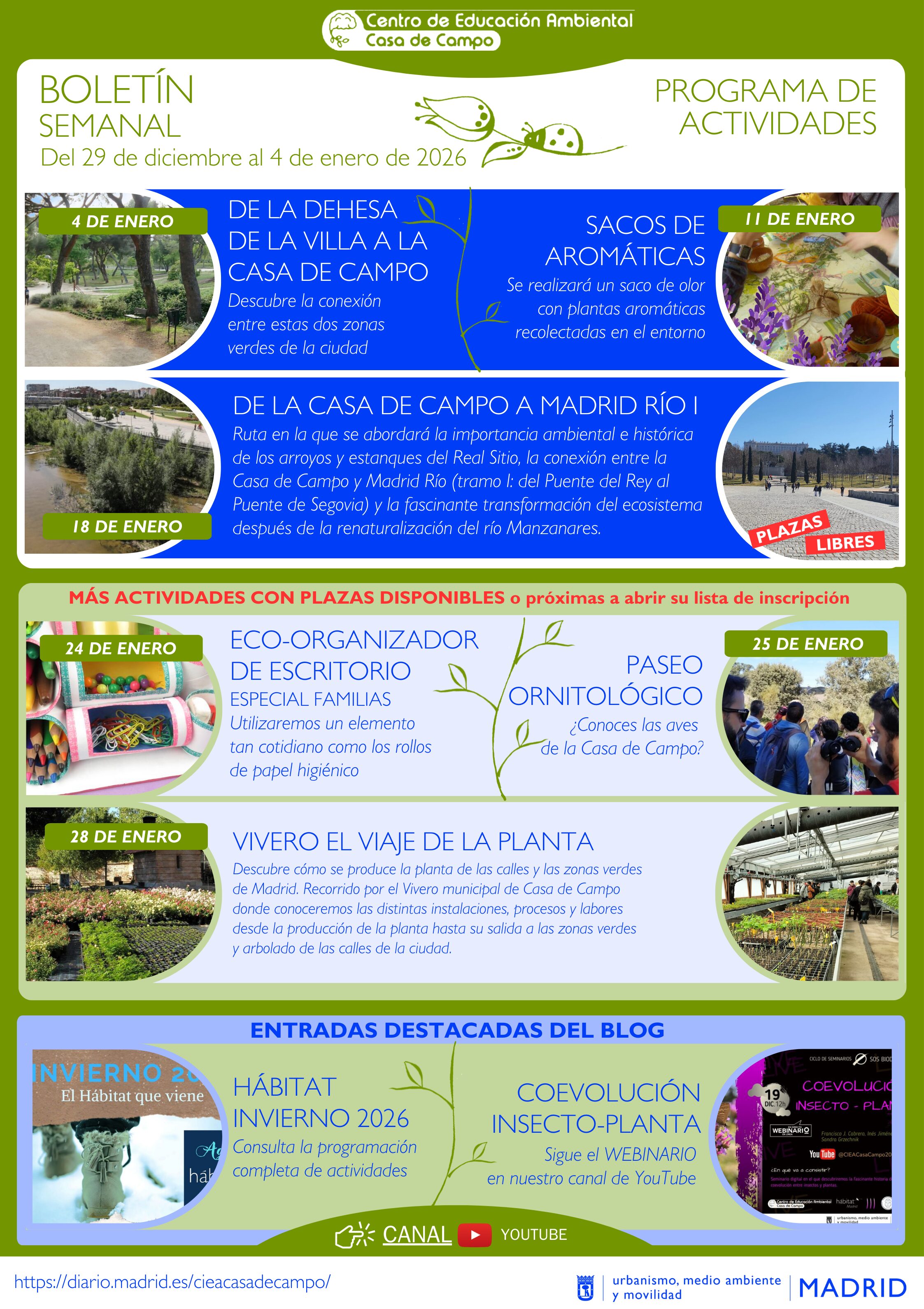 Como cada semana publicamos el BOLETÍN donde os proponemos las actividades ofertadas a través del programa educativo del CIEA Casa de Campo.