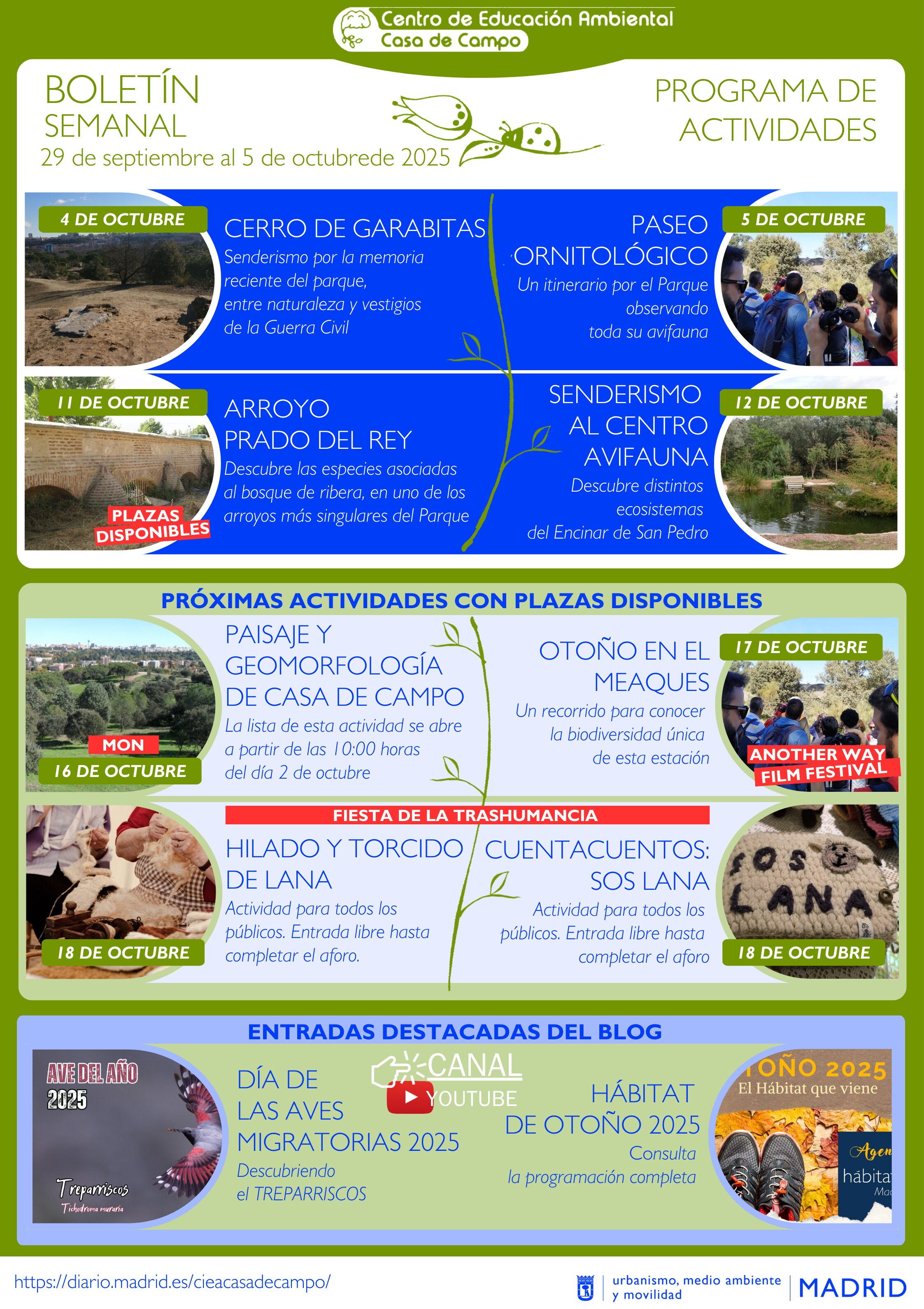 • Con letra azul: otras actividades para las que aún quedan PLAZAS LIBRES y que podéis reservar enviando un correo electrónico a: infocasacampo@madrid.es (recordamos la normativa de inscripción en el presente enlace).