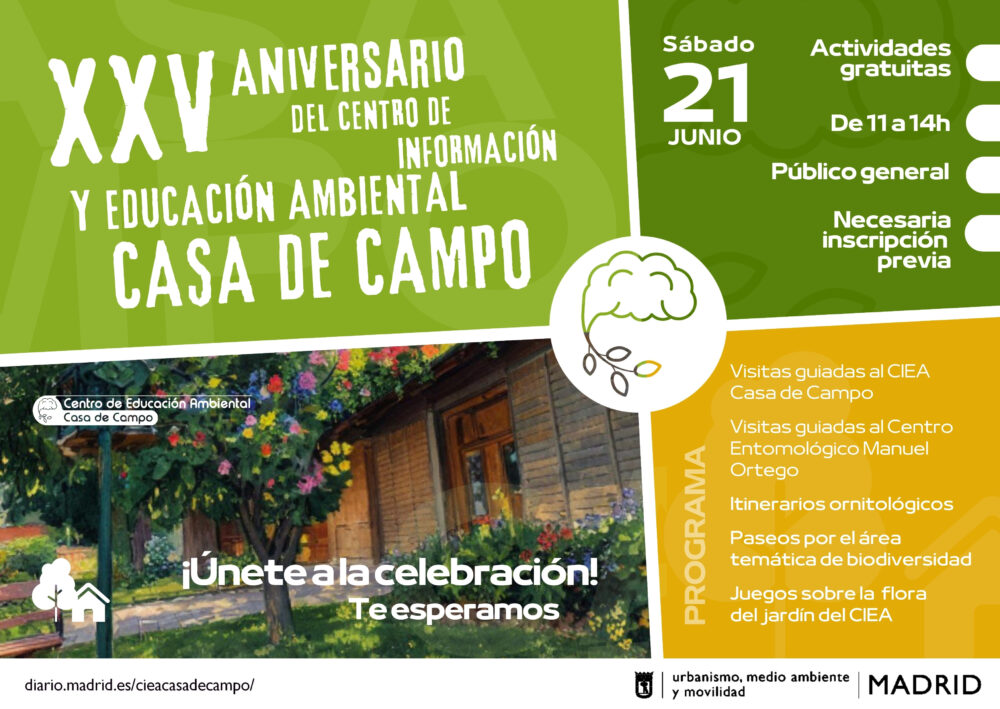 El 22 de junio se cumplen 25 años de la inauguración del Centro de Información y Educación Ambiental Casa de Campo y por ello queremos convocaros a una jornada festiva en la que dar a conocer el proyecto educativo a través de diversas actividades gratuitas.