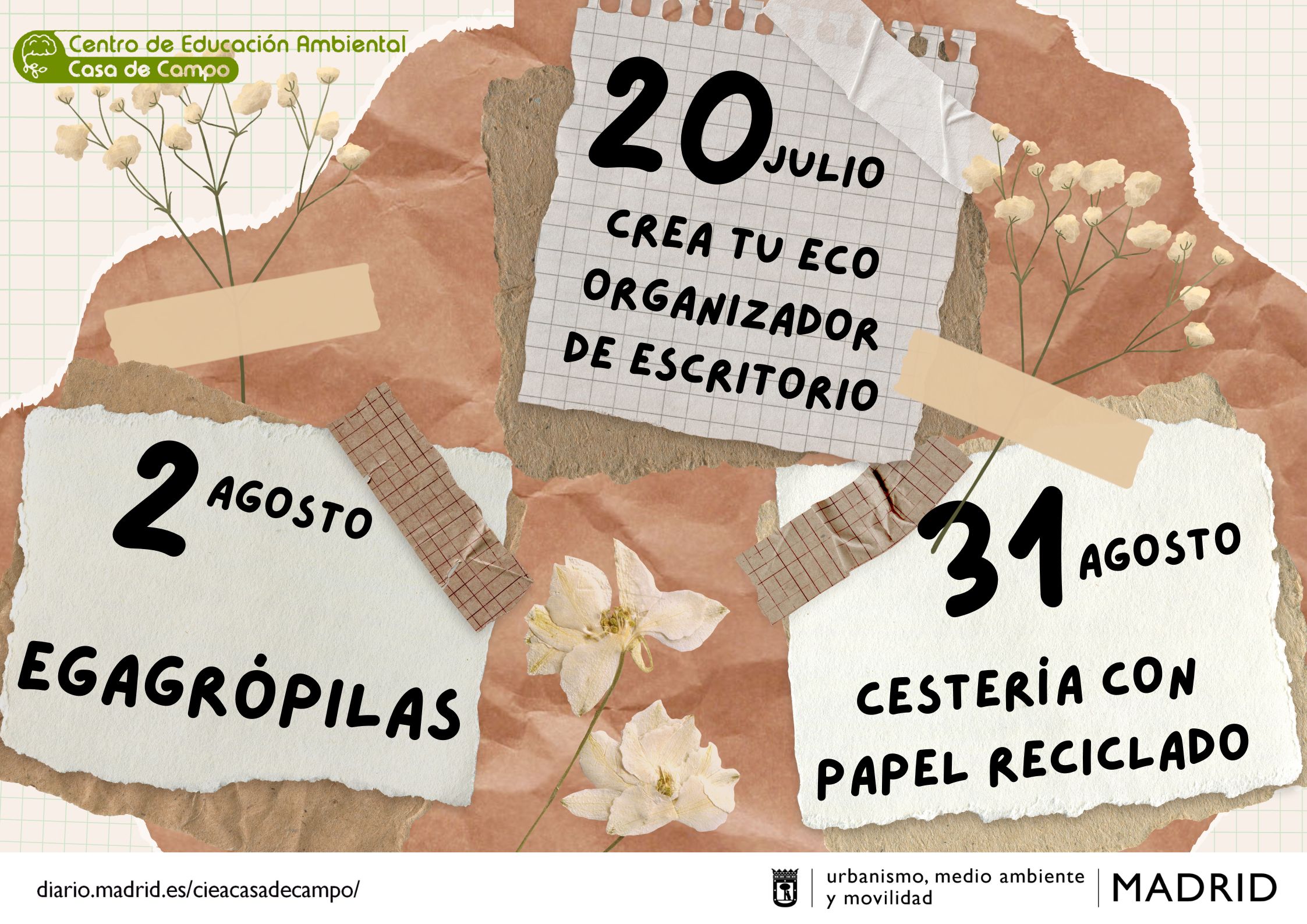 Recordamos que, para evitar las horas de máximo calor, adelantamos los talleres a las 10:30 horas los meses de julio, agosto y septiembre, y todos serán en el interior del CIEA Casa de Campo.
